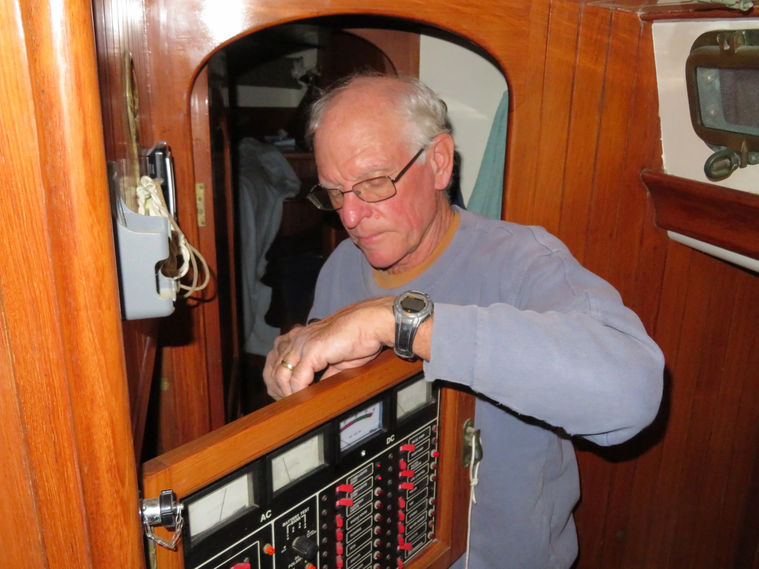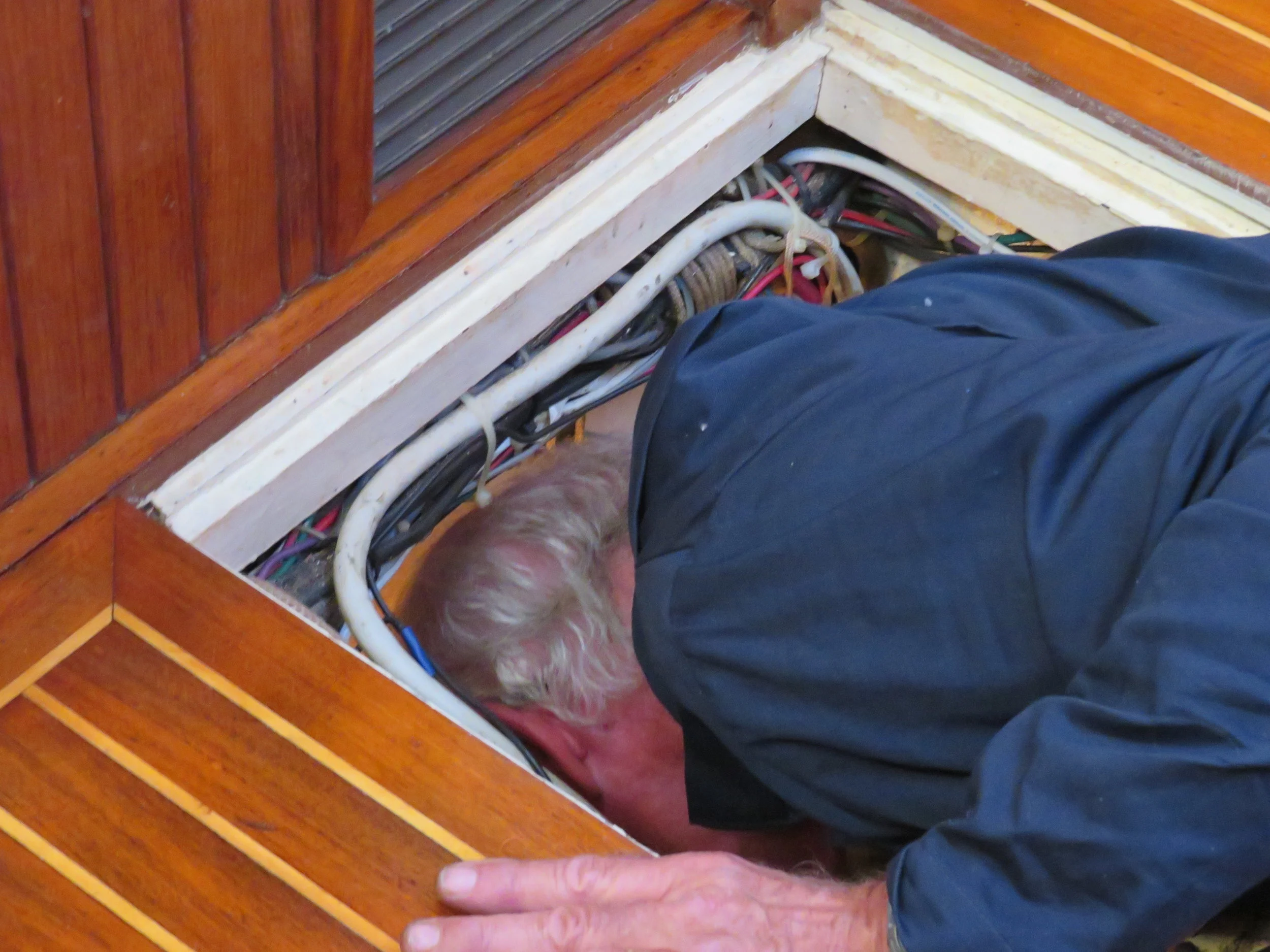 David has replaced a flaky voltmeter and resolved some minor engine issues. The bilge is all cleaned out and all pumps are operational. The hot water heater needed replacing, too, and a new one just arrived, ready to install. The major work, however, is above deck.