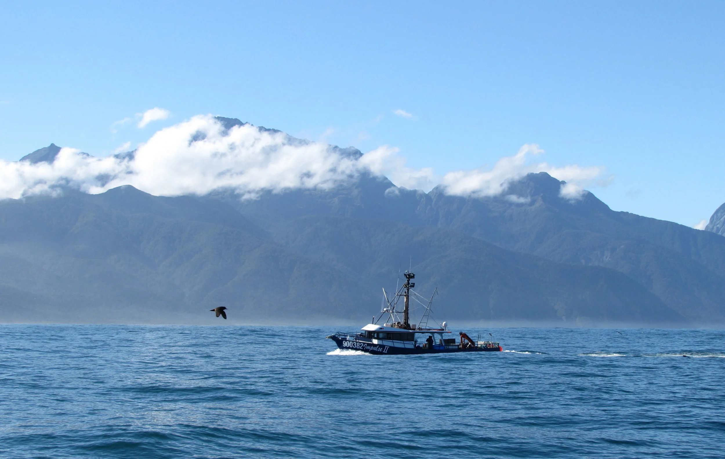 A fishing boat at the entrance to Milford Sound