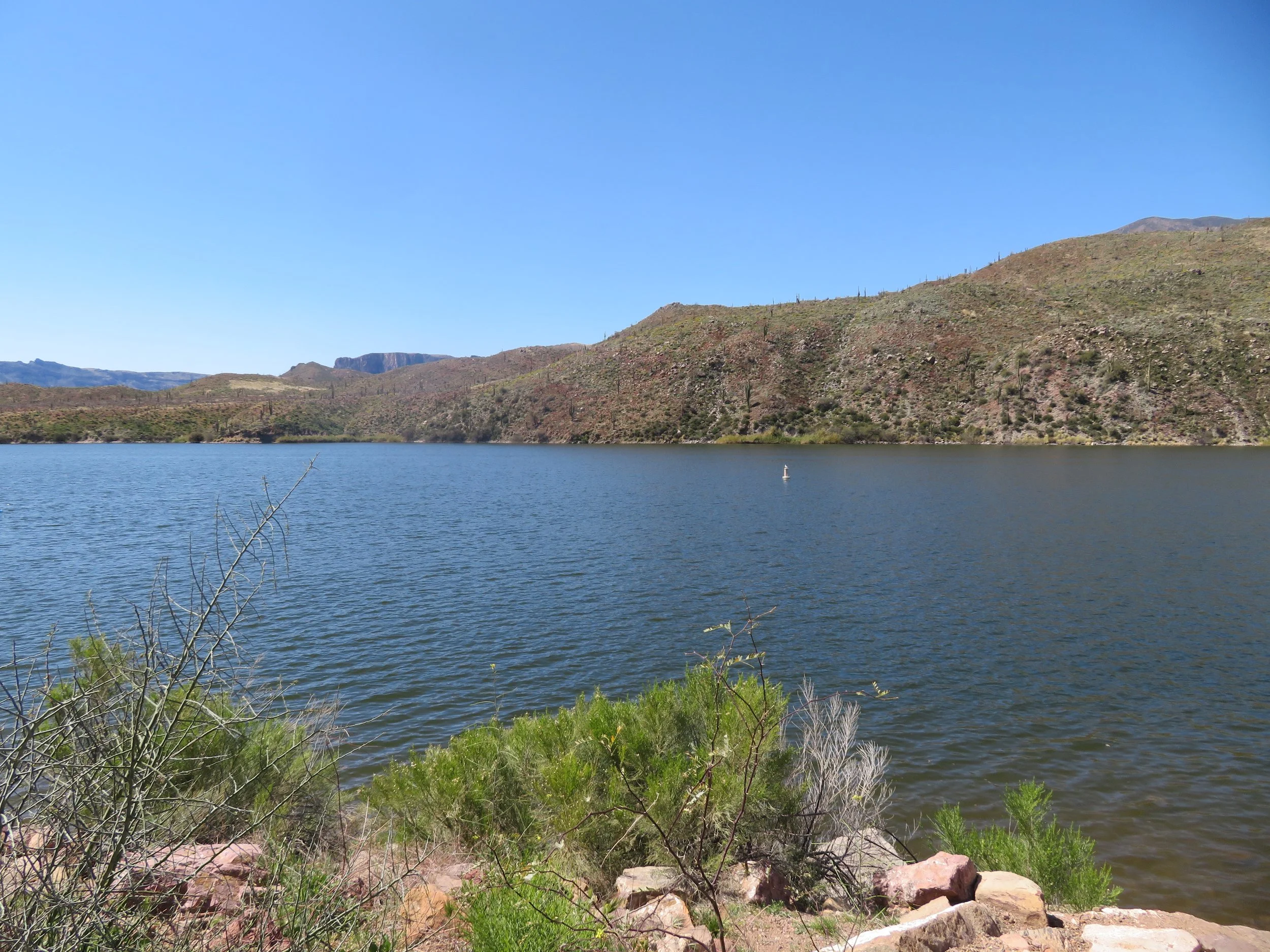 We arrived in late afternoon and after a careful reconnoiter, we chose campsite #8 which was level, spacious and very private. Thick foliage of palo verde, mesquite and scrub oak surrounded us and mingled with bright yellow brittlebrush and pink Apache plume, just coming into bloom. Saguaro cactus stood sentry on the hills above, flanked by cholla, ocotillo and prickly pear. A perfect desert setting overlooking Apache Lake, glistening in the late day sun. The campsite had a grill, a fire ring and a picnic table shaded by a ramada, most welcome when the sun was beating down directly overhead. Vault toilets were about 400 steps away… yup, I counted.