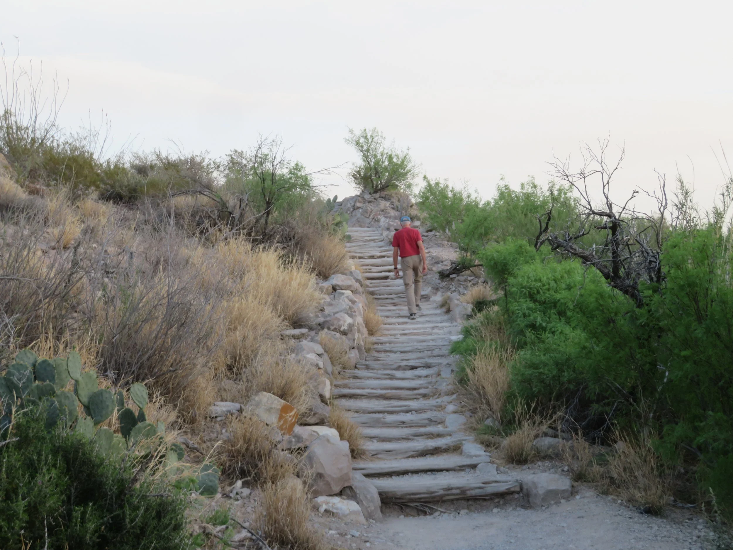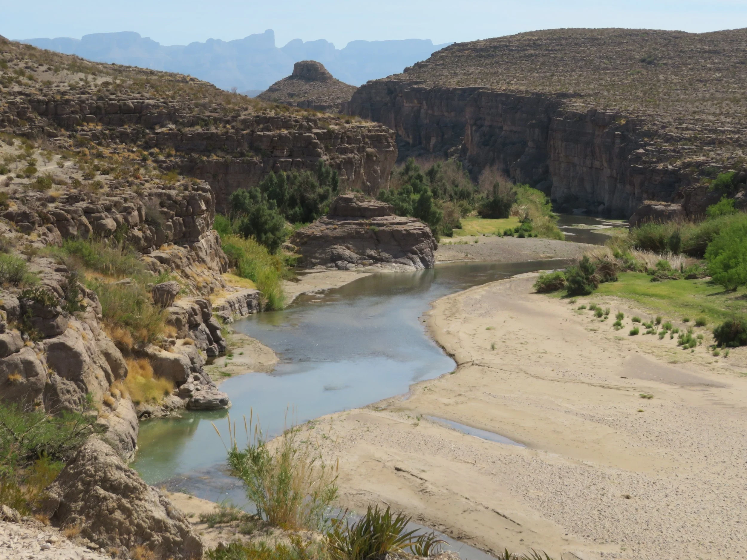 We climbed up a rocky path to the top of an overlook for 360º vista of the park. Sunset viewers had already snagged their spots for best views of the sunset, but sunset was still another half hour away. Impatient, we clambered back down and still had enough light to make our way along the sandy River Spur Trail and dipped our toes in the Rio Grande. A Mexican couple was on the opposite side and we waved to each other a rider was slowly making his way across the rocky hillside. The river level is low and walking across to Mexico or vice versa, would be easy. There are no border walls here.