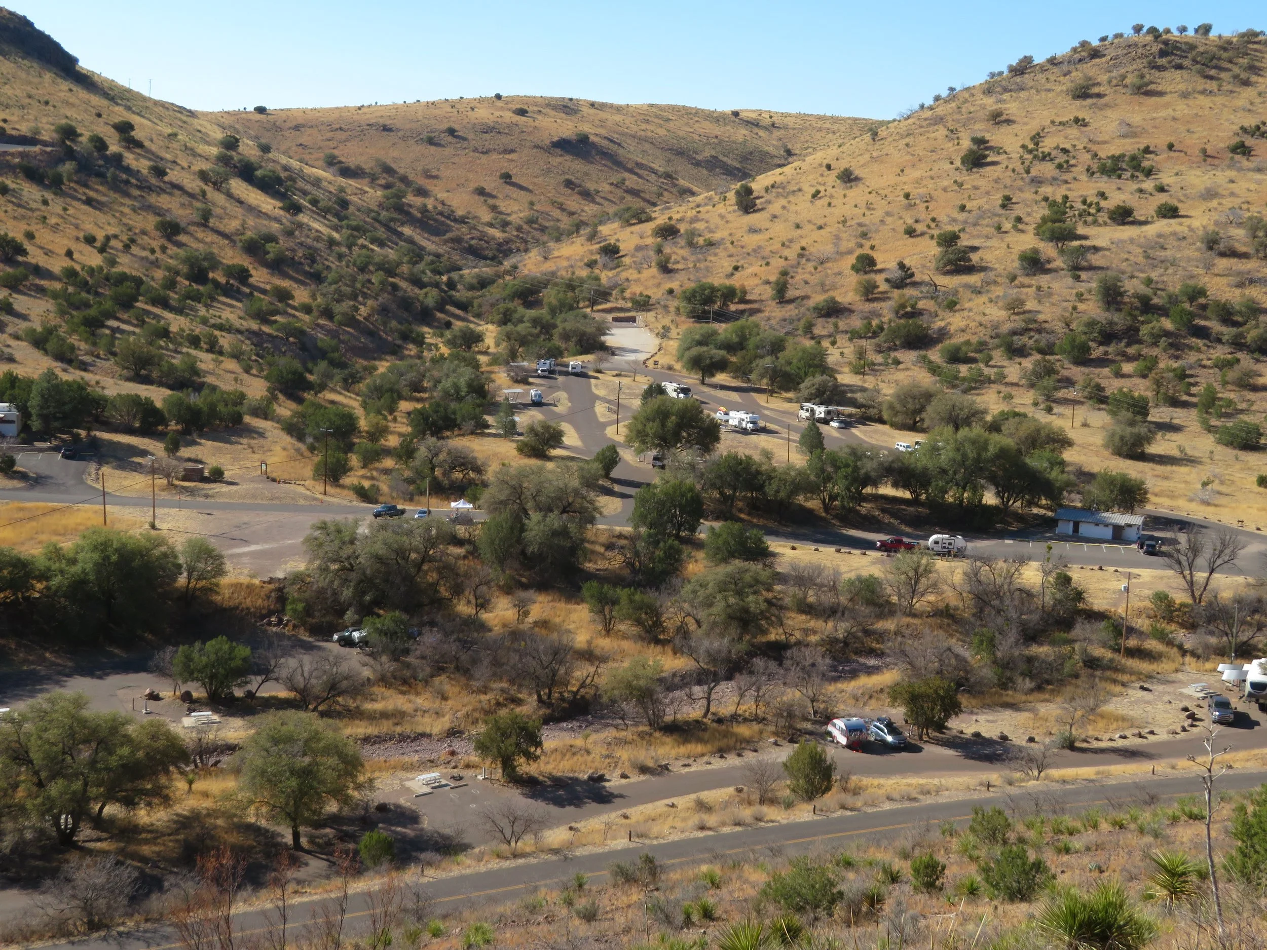 /Our ambitious plan to rise early and take one of the many hikes at Davis Mountains State Park vanished when we woke at 0645 and it was pitch black and cold (low 40s). We rolled over, dozed off for an hour and the sun was just starting to peek over the mountains. We settled for a short walk on the Montezuma Quail Trail, very steep, very rocky and nary a quail in sight. It did, however, provide a good view of the campground below and we could barely see Blanche under the big cottonwood tree.