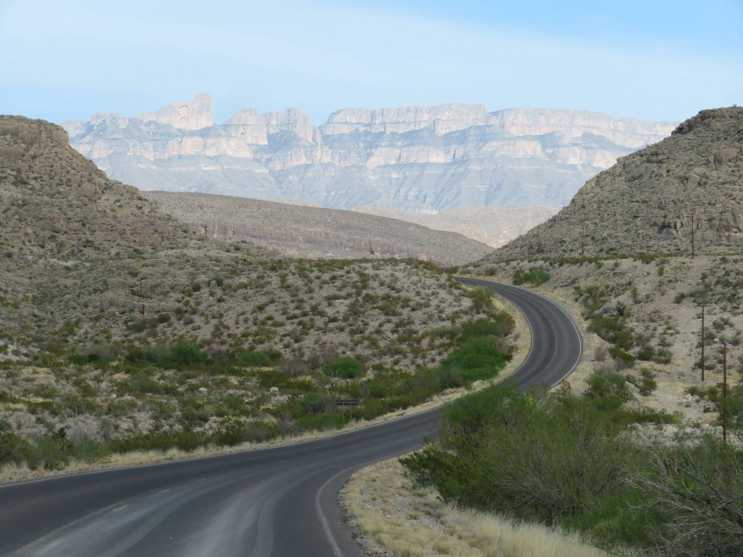 It’s another 30 miles from Alpine to Marathon, Texas and then another 40 miles to the entrance gate of Big Bend National Park. Admission is $30/vehicle for a week’s visit, but with a senior pass, it’s free. From the gate, it’s yet another 30 miles to the Panther Junction Visitor Center and another 20 miles beyond that to the Rio Grande Village Campground. In other words, it’s really a very long ways to anywhere. But the road stretching out before us was magnificent.