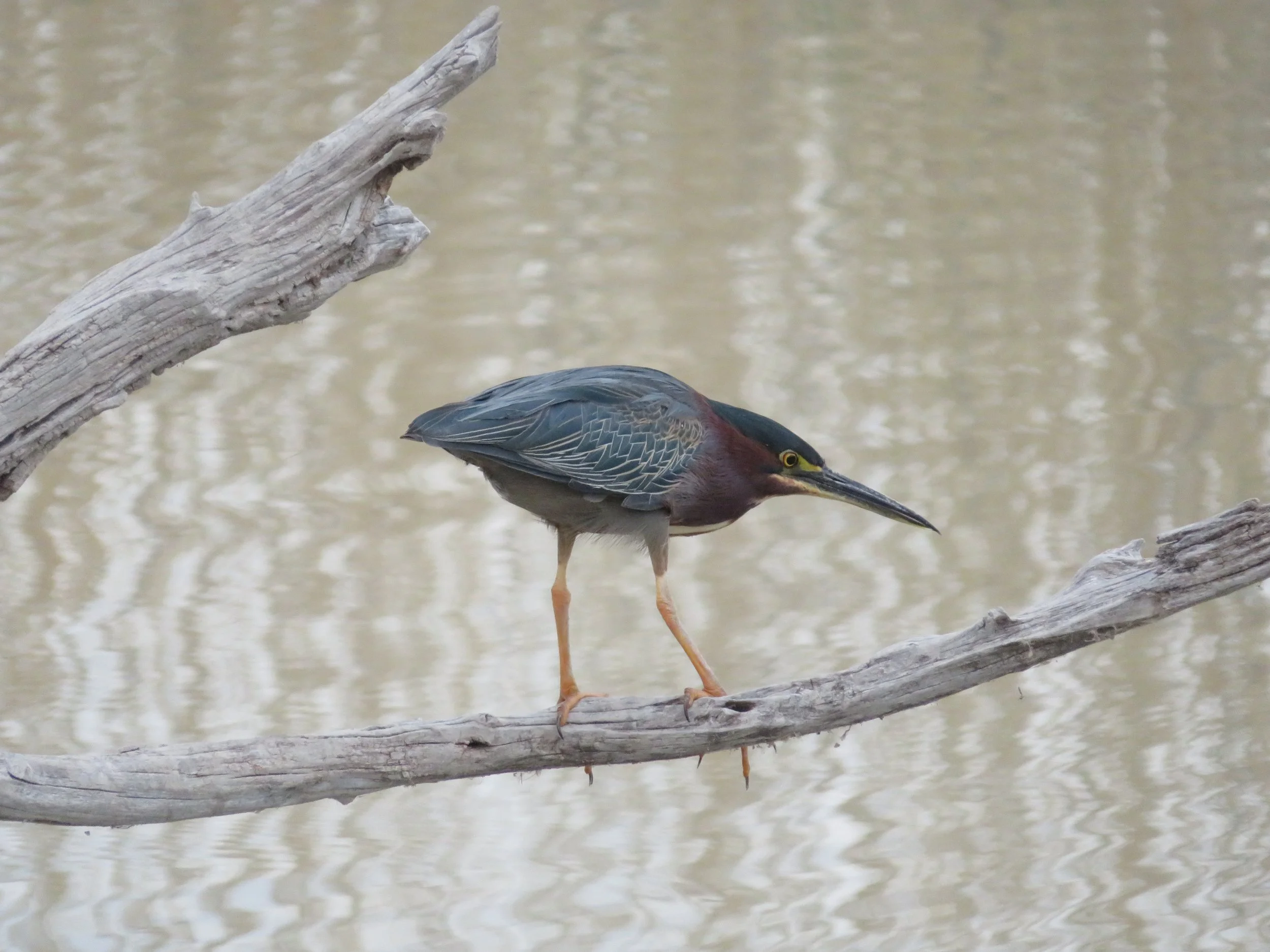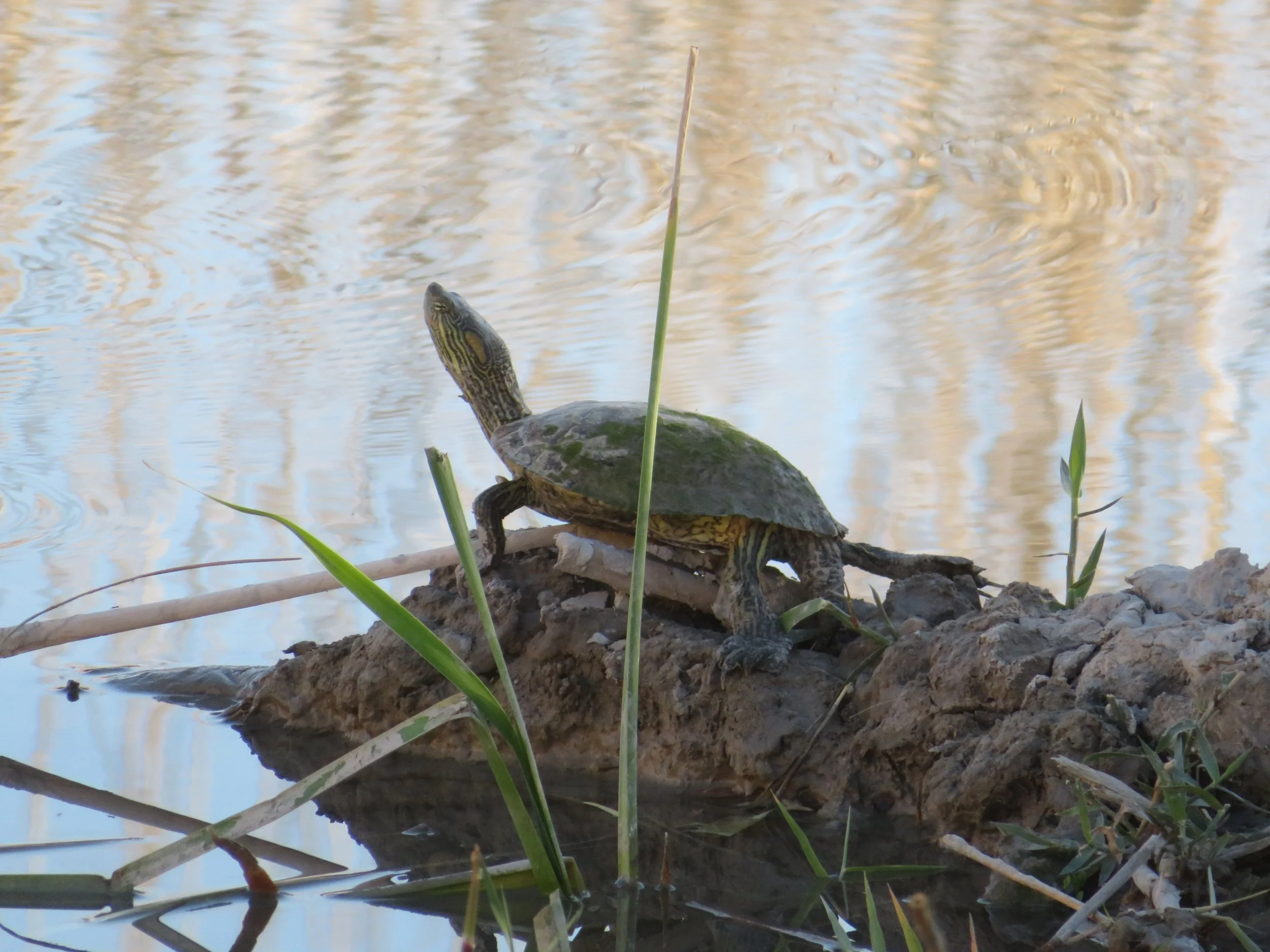 It was late in the day when we were settled in and decided on the short Rio Grande Nature Trail for a sunset walk. As much as I hate the dark early morning hours, I certainly appreciate the long sunlit evenings. We remembered this walk from our last visit to the park. We walked across boardwalk over tall grass and marshes. Bull frogs were croaking and a green heron was patiently waiting on the branch of a submerged tree limb for a dinner opportunity.