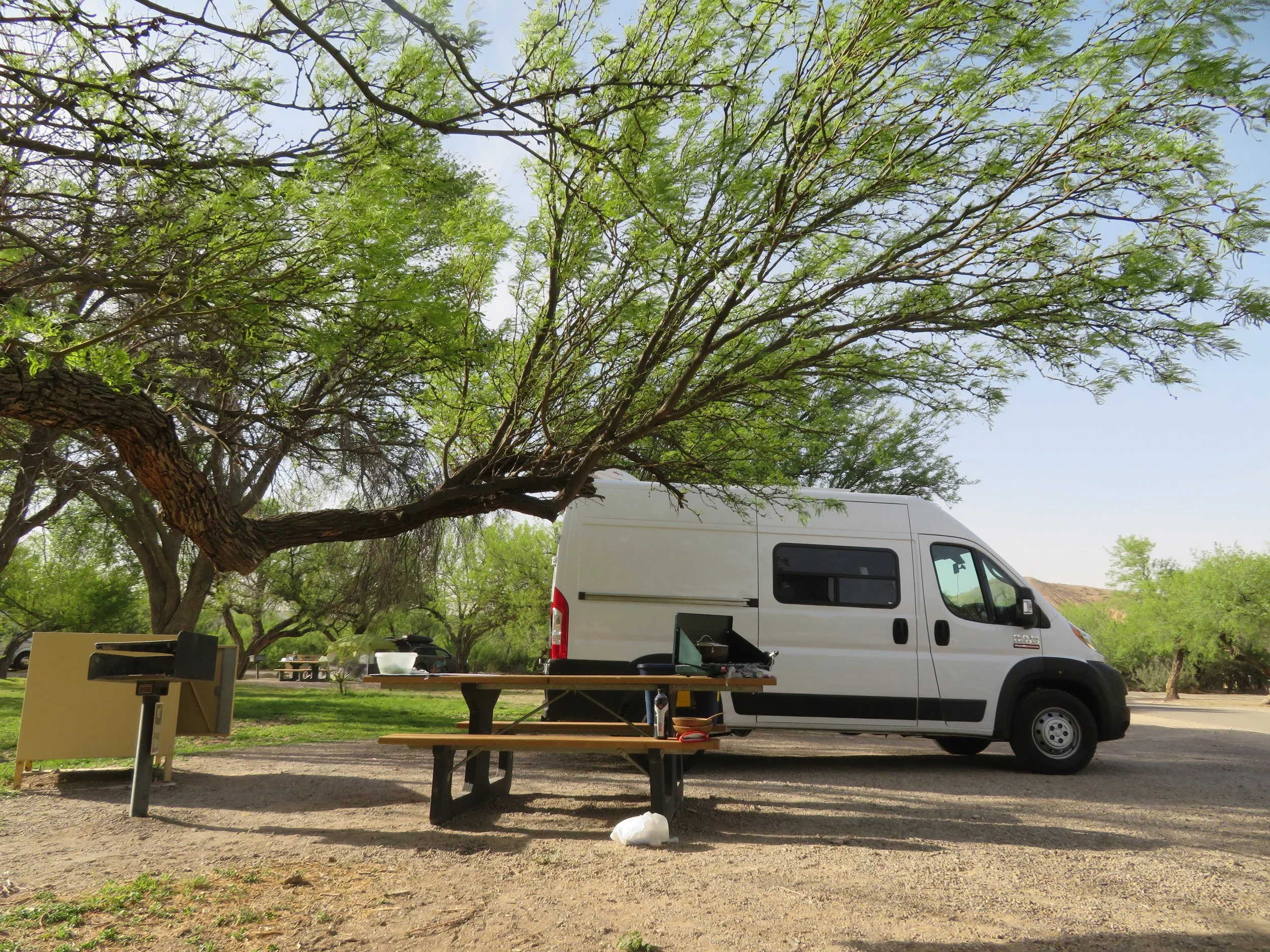 We made our way to our campsite. A large mesquite tree provided shade. We set up camp (which now only includes camp chairs, a camp table and our little 2-burner propane stove instead of a tent and cots and sleeping bags and… so glad to be back in a van!) and then walked a half mile or so over to the Rio Grande Village camp store to check it out. We only had to provision for 6 days, but our mindset had been a 3-month trans-ocean voyage. Needless to say, we had plenty of food on hand before we arrived. Still, we wanted to see what was on offer. Showers were $2/ 5-minutes; laundry $1.50/wash and 25¢/xx mins; gas $4.47/gal… still cheaper than Las Vegas! Food, beer, souvenirs and miscellaneous sundries were all available, but the prices were, as expected, pretty steep.