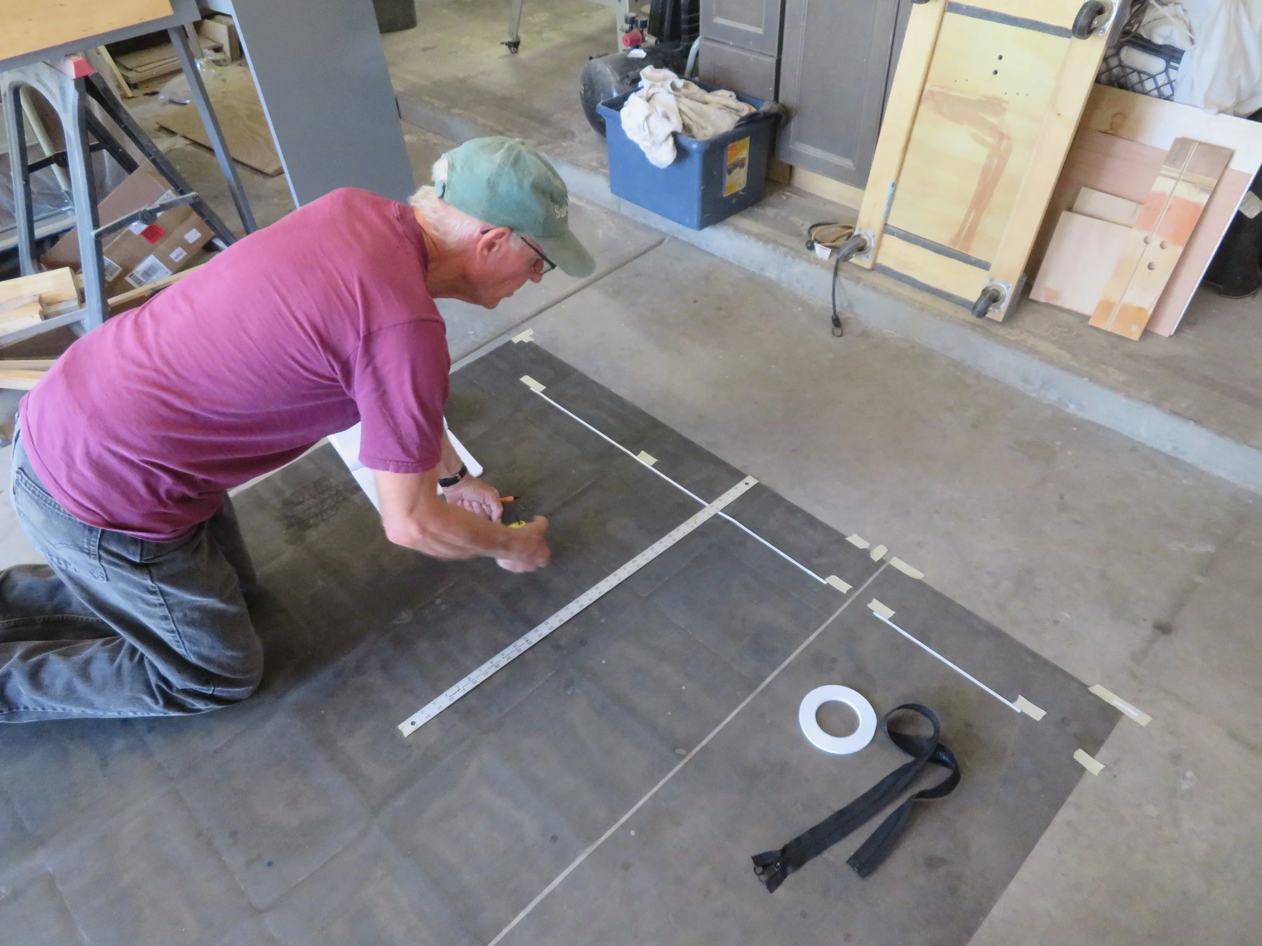 David measured, laid out, and cut the screen on the garage floor. We determined exactly how much room we needed to tuck the screening material behind the gasket and allowed a bit extra and marked it accordingly. We also measured and marked exactly where the zips should be placed.