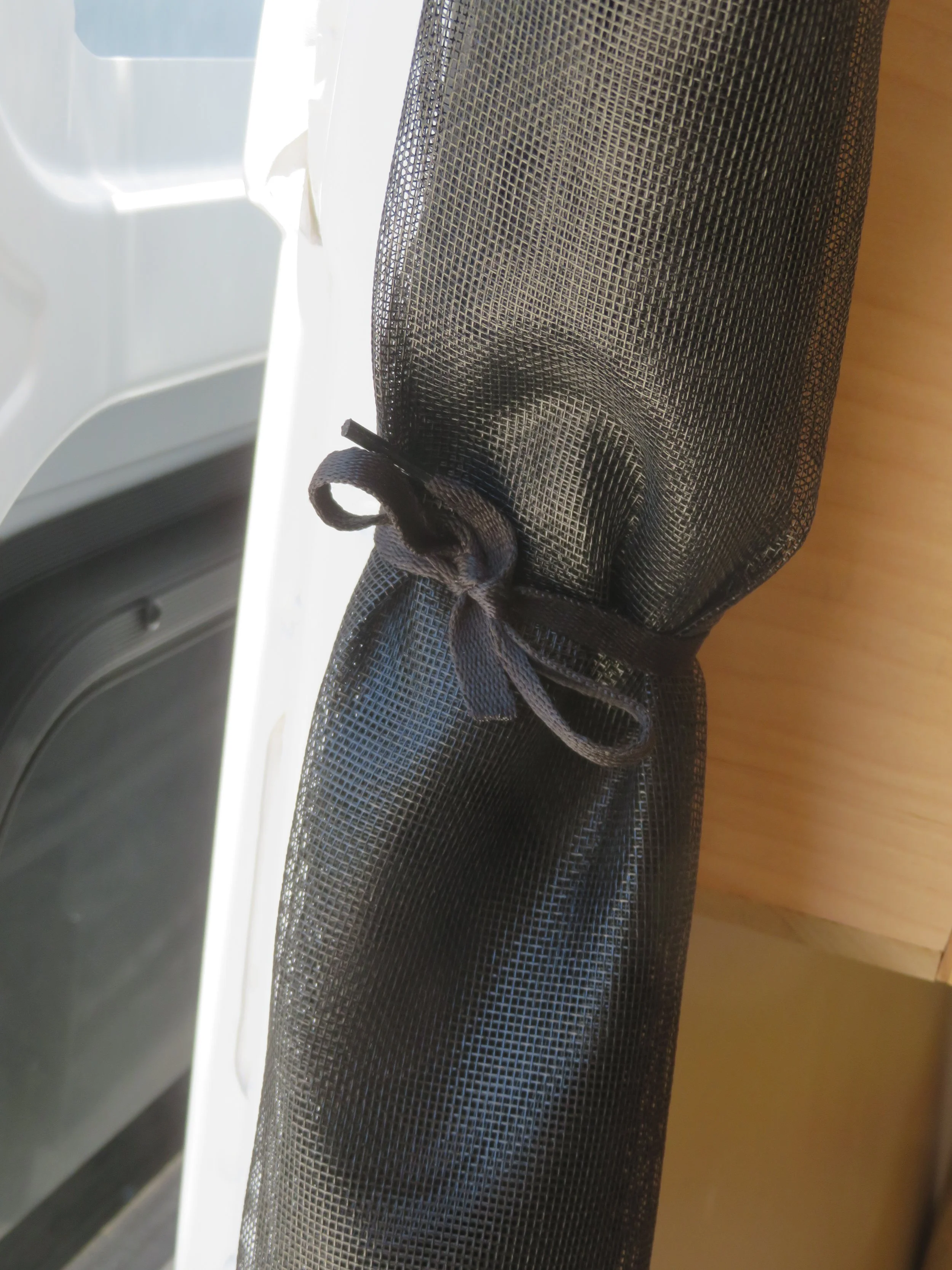 In the back, when the screening material is not in use, it can easily be tucked inside the inside edge of the van and be out of the way when opening and closing the doors. On the slider, however, there’s no room to tuck the screen inside the van without it getting caught in the door. We pondered solutions and it turned out that simple flat black shoelaces tucked under the door gasket in strategic places on the forward screen allowed us to roll the screen and tie it out of the way when not in use.
