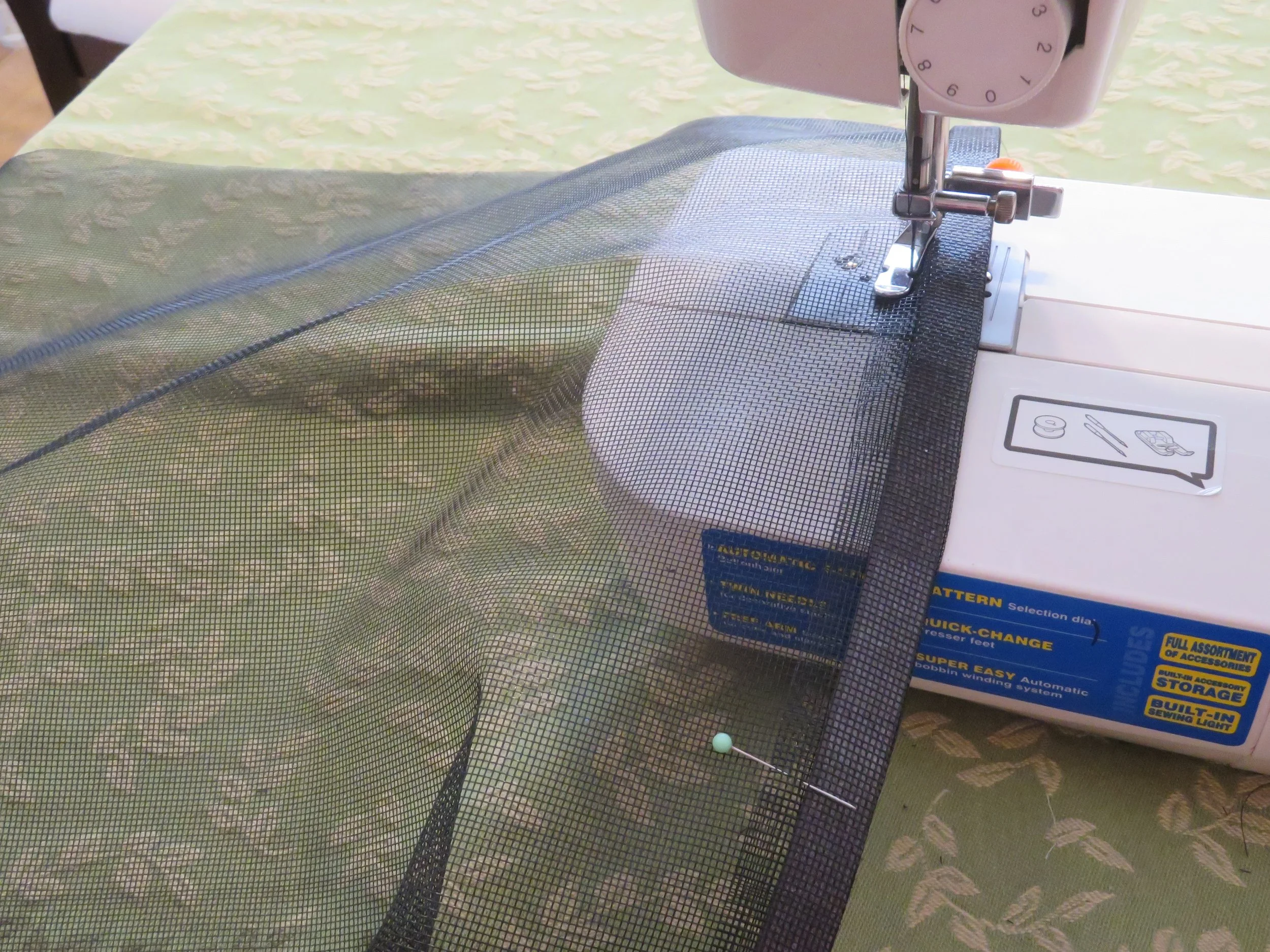 The self-adhesive on the reverse side of the magnetic tape might have worked if it was for a one-time, permanent installation, but since we intended it for constant entry and exit, we reckoned the tape would pull away from the screening material. Subsequent testing proved this theory to be true. I ended up sewing the tape inside a tube created along the entry edges of the screening material and it seemed to work just fine. I hadn’t anticipated how the magnets would be attracted to the metal surfaces of the sewing machine, pins, scissors, and any other piece of nearby metal, so the going was slow at times, but not unmanageable. David installed the finished screen in about an hour. We can open the entry door easily and then it pretty much closes by itself when the magnets come in contact with each other.