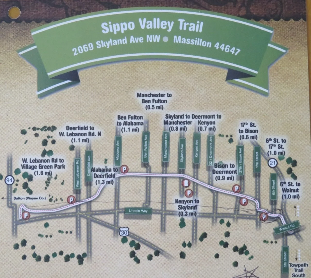 The Sippo Valley Trail is partly paved and partly crushed limestone… easy, smooth riding, on a pleasantly warm day. There are benches, parks, and porta-potties conveniently located along the way. Quite civilized!