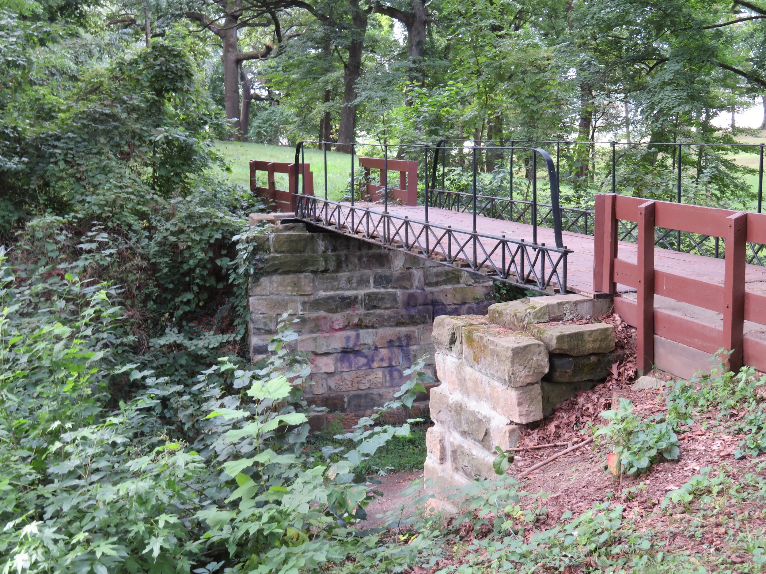 On the Massillon end of the trail, we stopped for breakfast at picnic tables in pleasant Oak Knoll Park. The Howe Truss Bridge was close by and we took a look. Originally constructed in 1859 in Massillon, it is the oldest known standing iron bridge in Ohio. Originally built for a road in Alliance, Ohio, it was moved to Massillon in 1899 (not quite sure what replaced it) and put into place at the park as a part of Stark County history. It was restored in 2010.