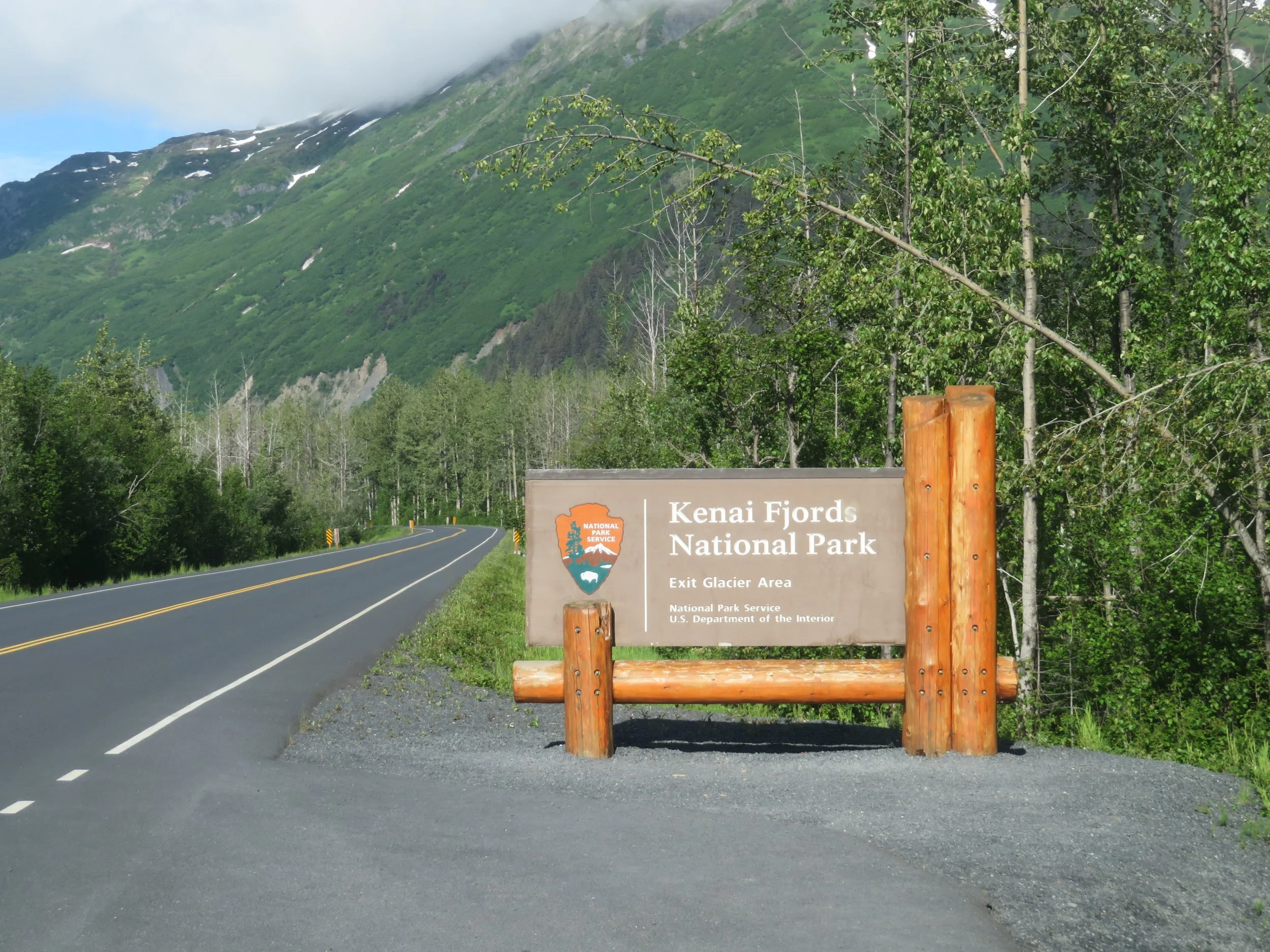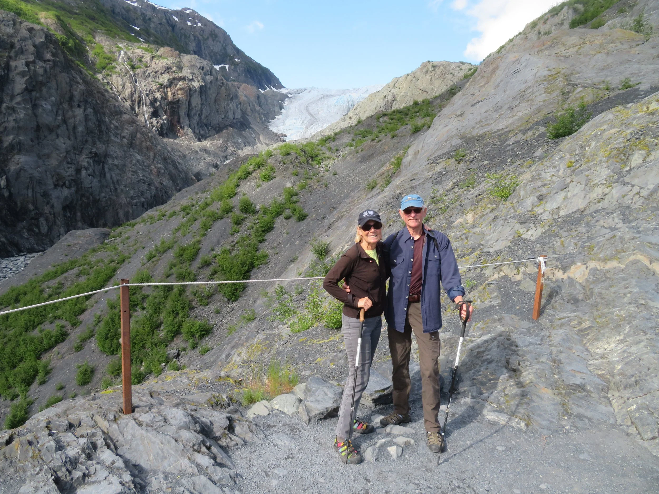 What’s this? Sun? Yup, a sunny morning dawned. We backtracked a few miles to visit Kenai Fjord’s National Park… along with a zillion other tourists, many of whom arrived by the bus load. The Nature Center there was informative with a helpful staff that provided a trail map for the Exit Glacier Overlook, the closest we could get to the glacier other than flight-seeing.