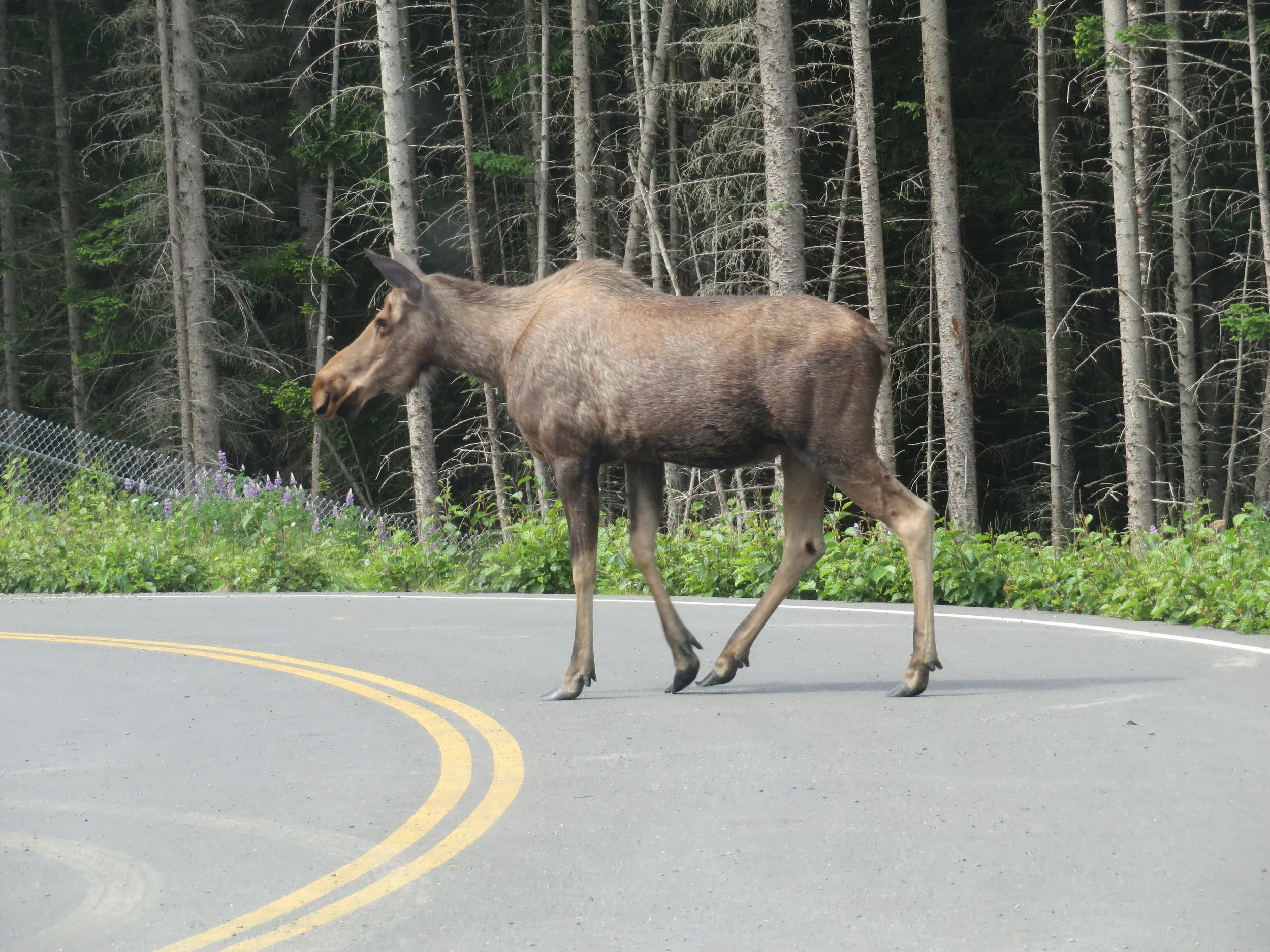 The moose population in this area is evidently extremely high and the moose really like crossing the highway thus the collision rates are high. An elaborate system of high fences that attempt to channel the moose to highway underpasses has been constructed.