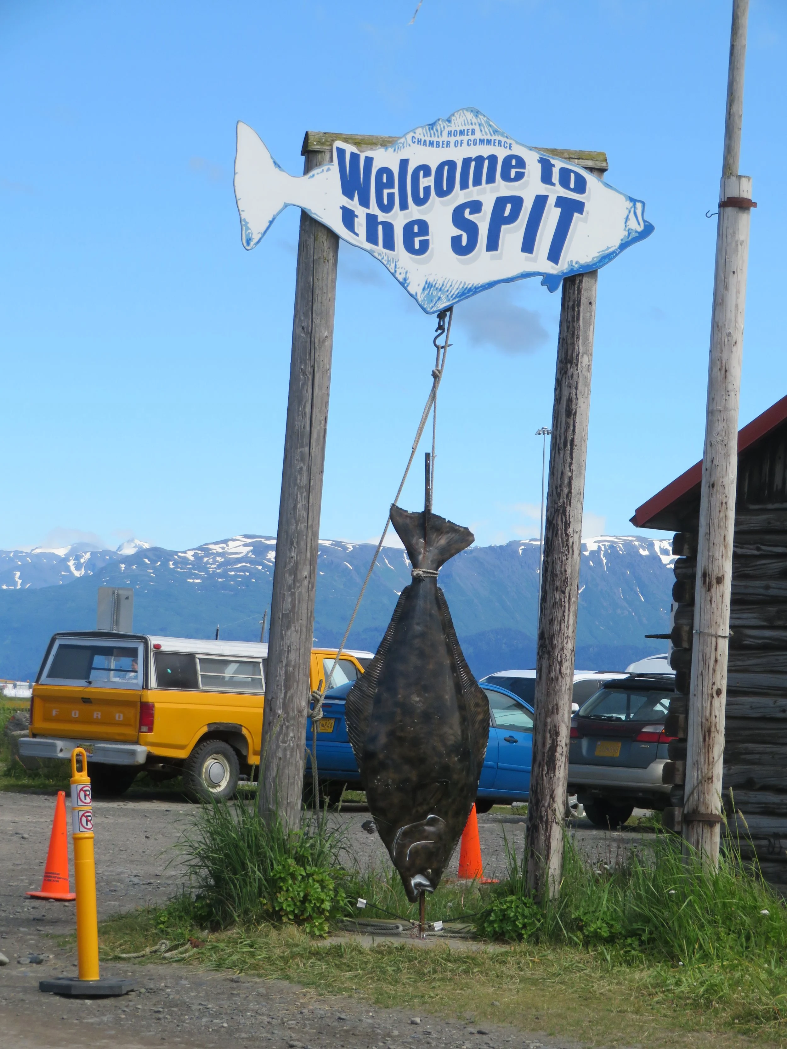 Another 20 minutes and we were coming over the hill and looking down on the Homer Spit at last. We’ve driven this road twice before and on a gorgeous day like today, we still consider it one of the most beautiful sights in the world. The extremely thin slip of land that juts out into Kachemak Bay is known as ‘The Spit’, the abrupt terminus of the Sterling Highway. According to several sources, “the Spit features the longest road (4.5 miles) into ocean waters in the entire world”.