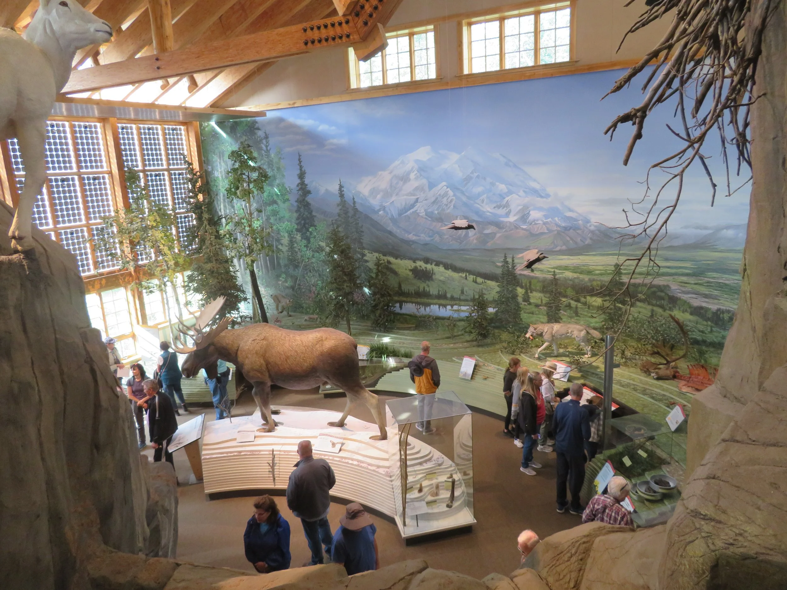 Though crowded and a bit frenetic, the Visitors’ Center is beautiful. Two videos were showing. There were several exhibits and dioramas highlighting Denali’s history, geology, flora and fauna.
