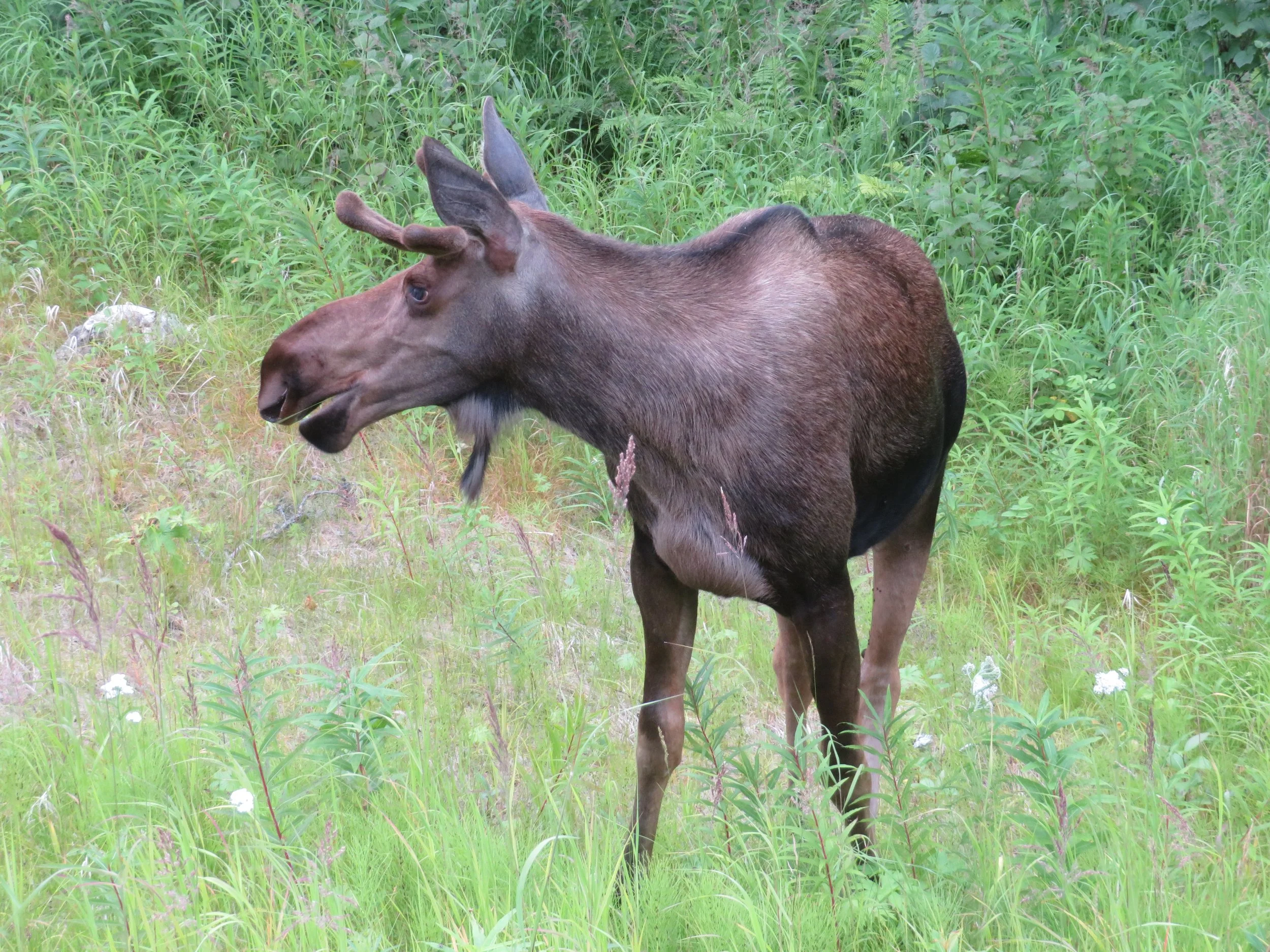 After several days of being spoiled by beautiful weather, clear skies and magnificent views of Denali at K’esugi Ken, the last couple of days had been less than spectacular and our departure day dawned overcast and gray. Just as we turned onto the Parks Highway, we spotted a bull moose grazing on the side of the road which we took as a good omen.