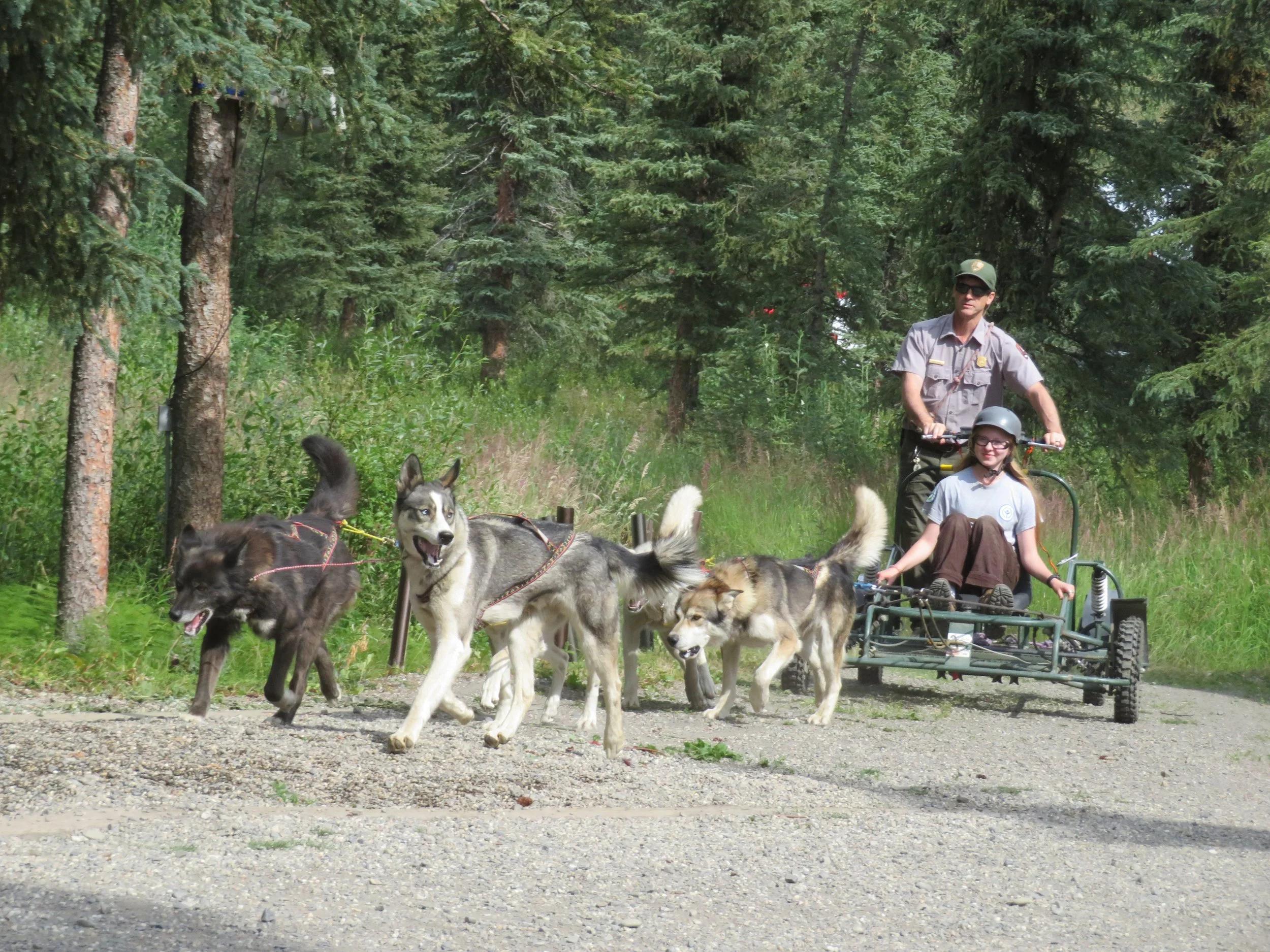 Then the dogs, barking and excited, were hitched to a cart and whoosh… they took off like a shot, a ranger/musher giving only verbal commands as the team sped along a track and came to a halt directly in front of the crowd. Pretty impressive.