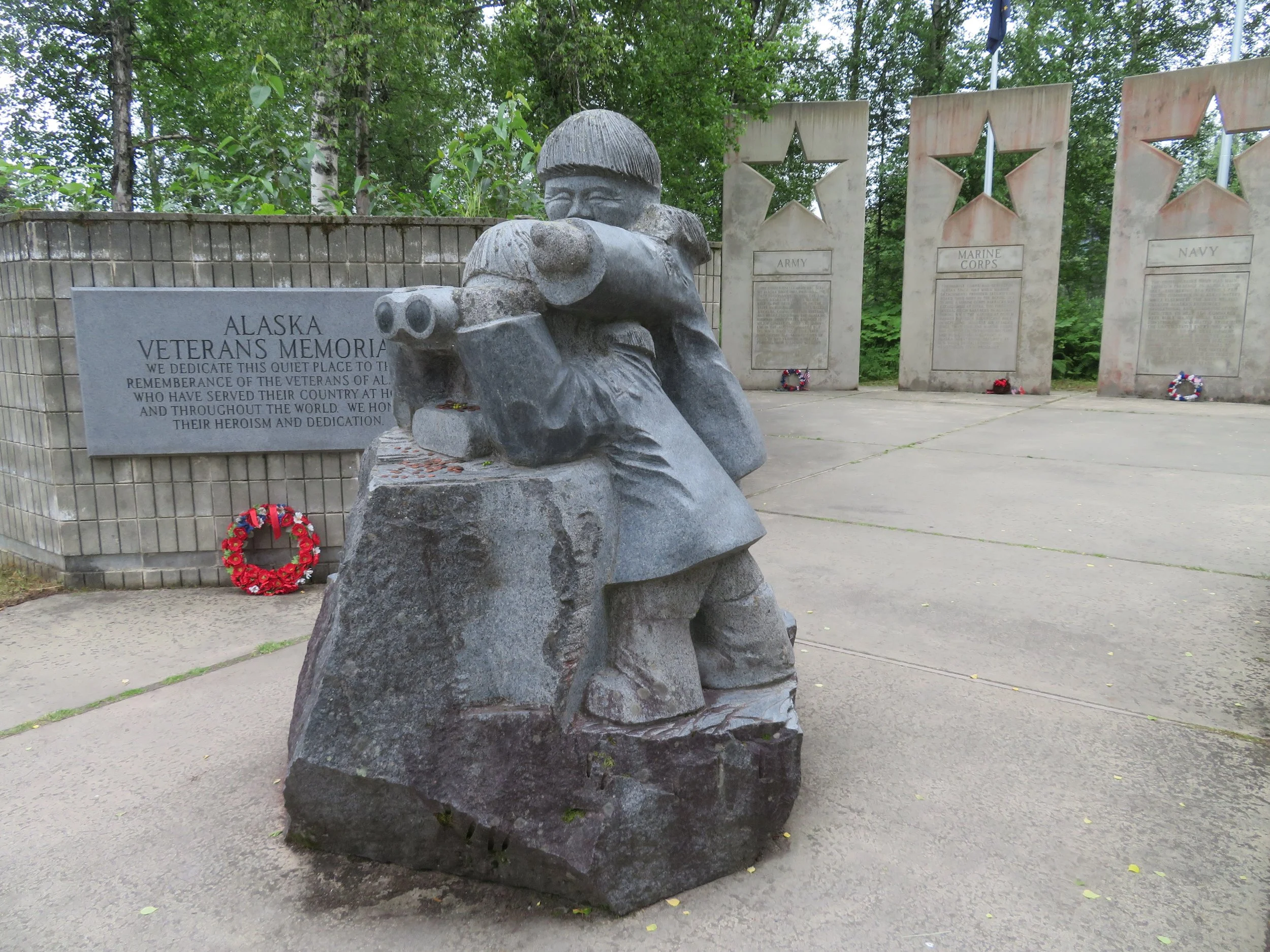 We stopped briefly en route at the Alaskan Veteran’s Memorial near Byer’s Lake. It’s a quiet, respectful place, an elegant, fitting tribute to Alaskan citizens who have served their country and given their lives in service. Our visit was cut short by hordes of mosquitoes out for blood.