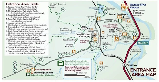 After switching campsites the next morning, we walked the 1.5 miles to the Visitors’ Center on the gravel Roadside Hiking/Biking Trail. Regularly scheduled shuttle buses are available in case folks would prefer to ride. The Alaska Railroad also has a station next to the Visitor Center on its Anchorage-Fairbanks route.