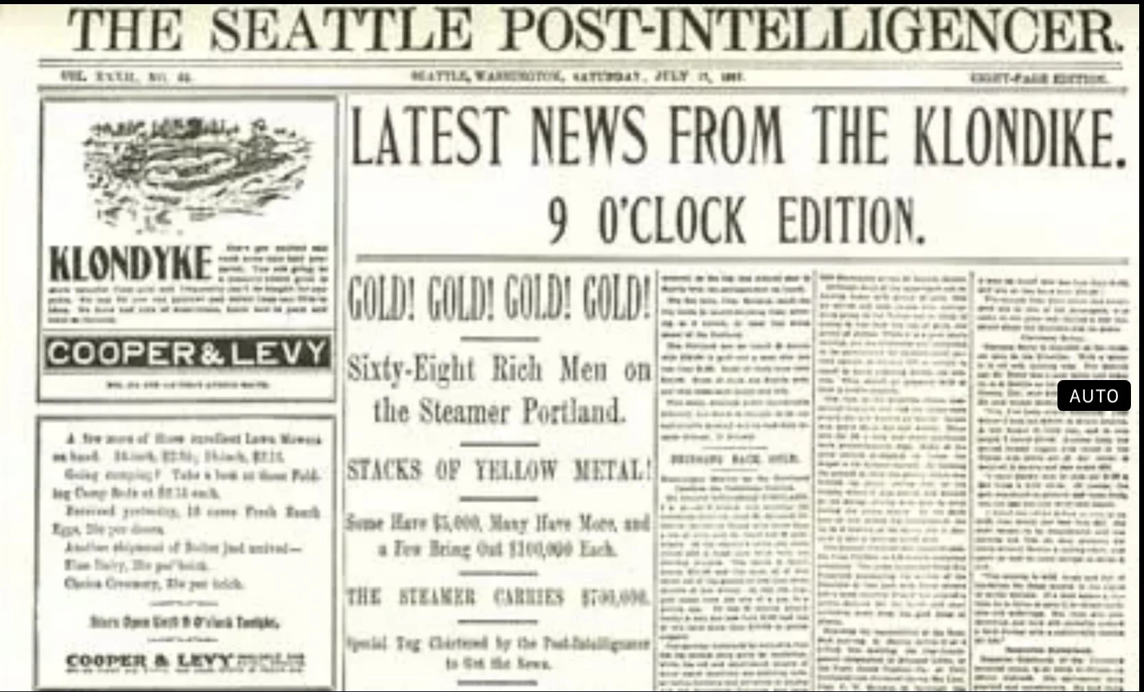 Imagine that it’s 1897. The country is in the middle of a recession, jobs are hard to find, inflation is rampant and unemployment is high. Then, the 60 point headline on the front page of every newspaper in the U.S. is “Gold Strike in the Klondike!”, followed by articles describing how gold nuggets are lying in the river beds, ready for the taking, and how this may be the richest strike in North American history. It doesn’t matter whether you are the ne’er-do-well son of a wealthy businessman, a carpenter having a very tough time keeping your wife and five kids fed, a card shark and con-man, or anyone in between, the lure of a great adventure and the dream of finding fabulous wealth might prove irresistible. It certainly was for an estimated 100,000 gold seekers who joined the greatest gold stampede in history.