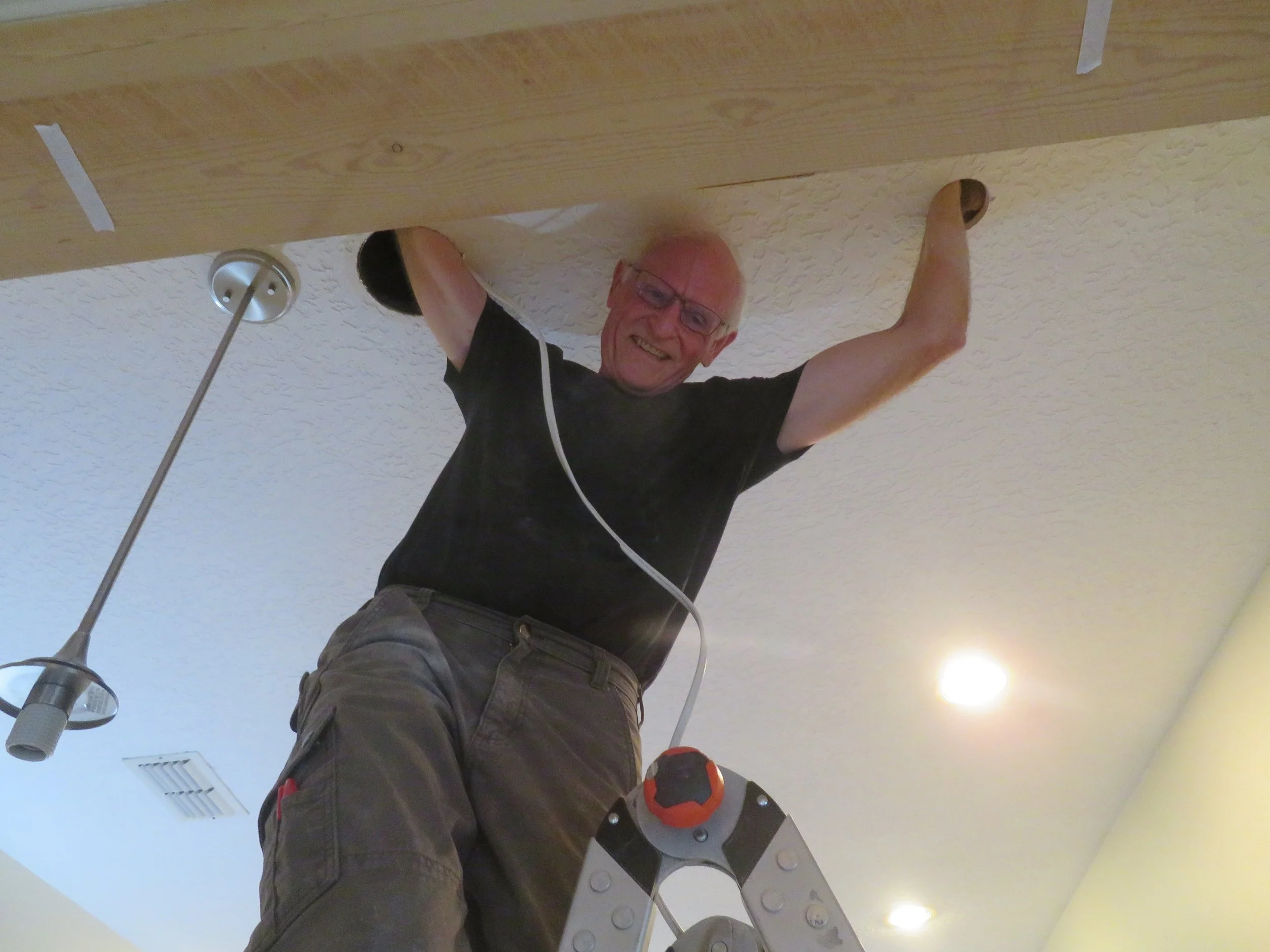 We lugged in the kitchen side countertops and watched as David butt-joined them with zip bolts. Next came the installation of the sink, then the faucets and plumbing, the garbage disposal and the dishwasher connection. He moved the induction stove into place and leveled it. Gentry and I painted the newly finished pantry area, the stove vent and adjacent walls and slapped a coat of paint on the entryway wall. A good day’s work.