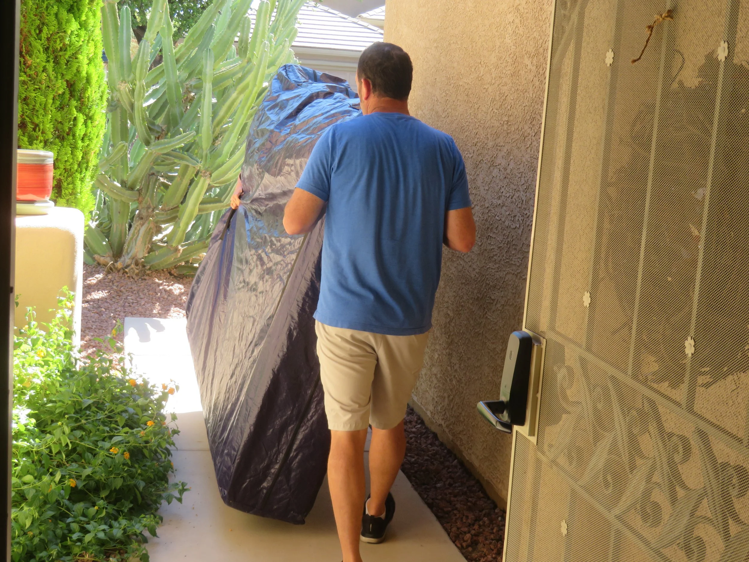 It arrived promptly a few days later, compressed and rolled up inside a large box. It was quite heavy – 103 pounds to be exact, not to mention very unwieldy, so getting it out of the box, onto the bed frame and out of its 200 yards (or so it seemed) of plastic shrink wrap was somewhat challenging for us septuagenarians, but we managed.