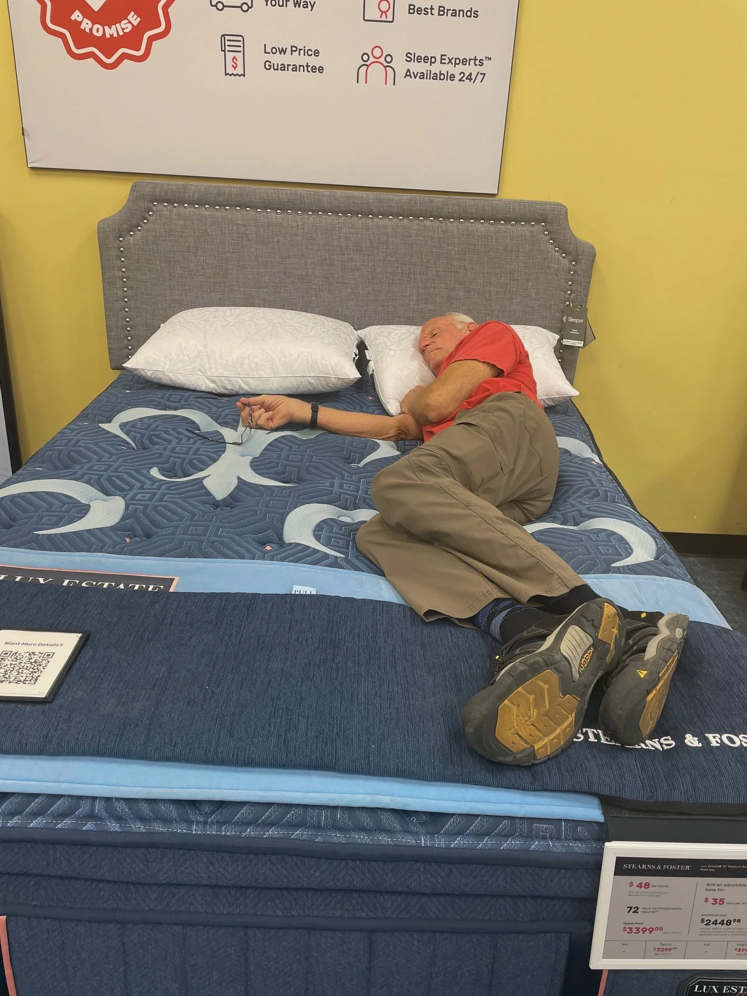 Our oldest son, Brennan, told us that the best mattress he’d ever slept on was the mattress used by the Westin Hotels. We researched it and found out that Westin does, indeed, sell their mattresses, the Heavenly Bed Mattress, to consumers, and our local Pottery Barn store had one in stock if we wanted to lie down on one. We made the trip, and discovered that the mattress was part of a sales display, showcasing bedding, a comforter, a sham, and half a dozen throw pillows, but the salesperson had no qualms about tossing all the bedding on the floor so that we could lie down on it. We did feel a little weird, however, being stretched out on the bed in the middle of a Pottery Barn with other shoppers having to step around the pile of bedding we’d thrown off. The mattress did seem quite comfortable, and I think we would have gone with it except for two itsy, bitsy problems. First, even with it being on sale, by the time the shipping and sales tax were added, the mattress cost was around $3400! Gulp. And if we did bite the bullet and decide to give it a try, there would be no returns – neither Pottery Barn nor Westin allows returns on mattresses. We decided it was too risky to spend that much money on a mattress we’d spent five minutes trying out.
