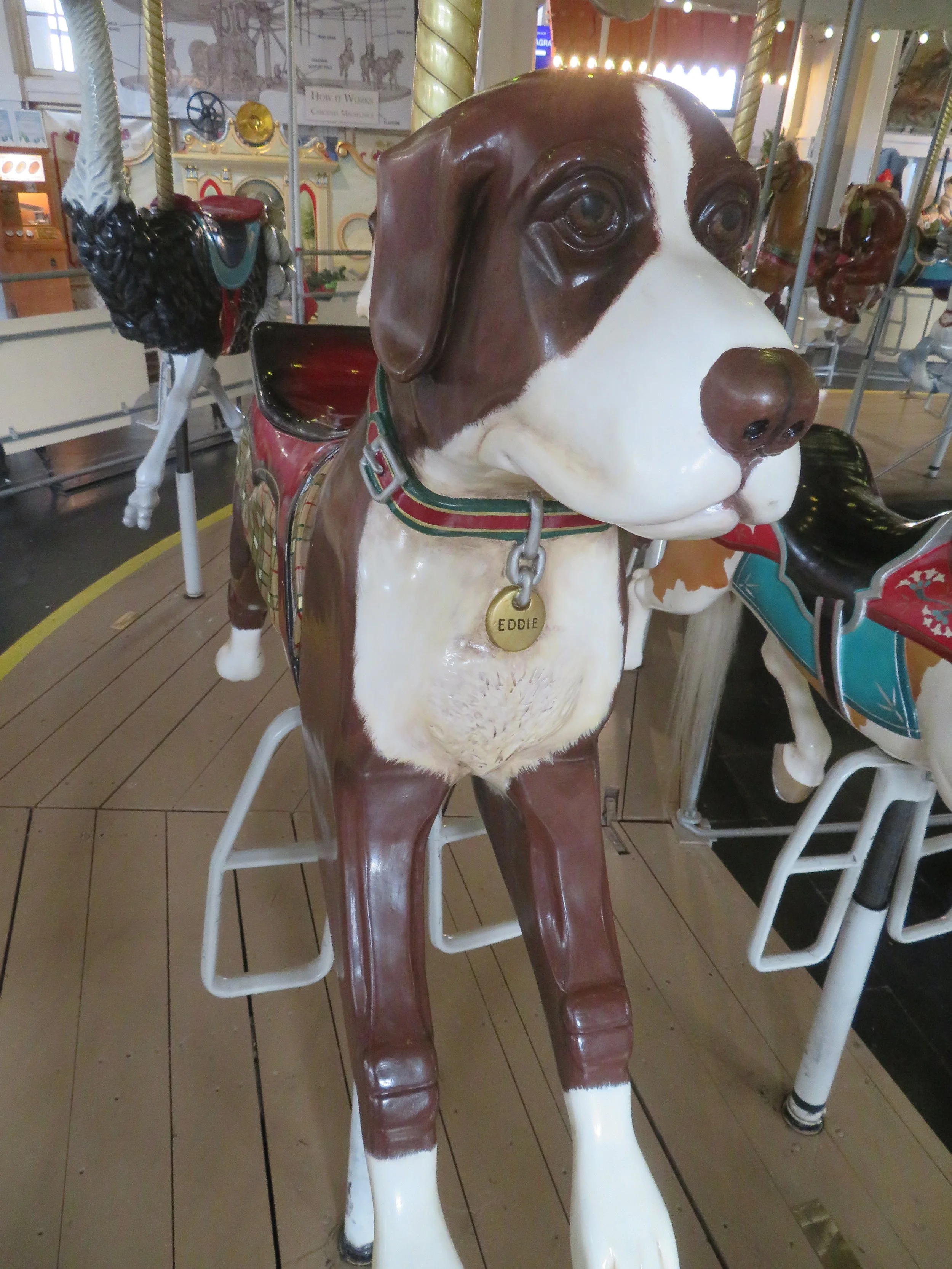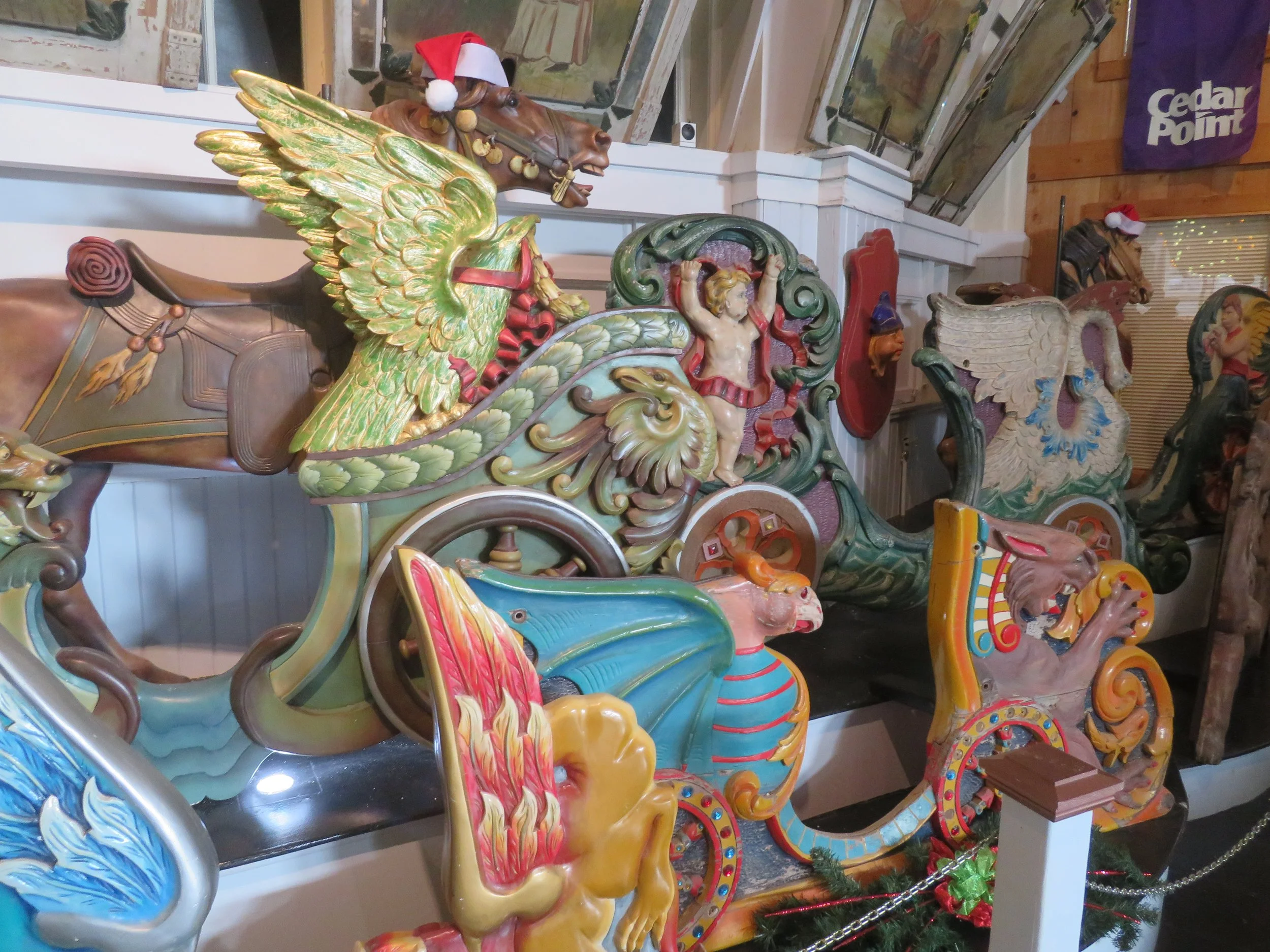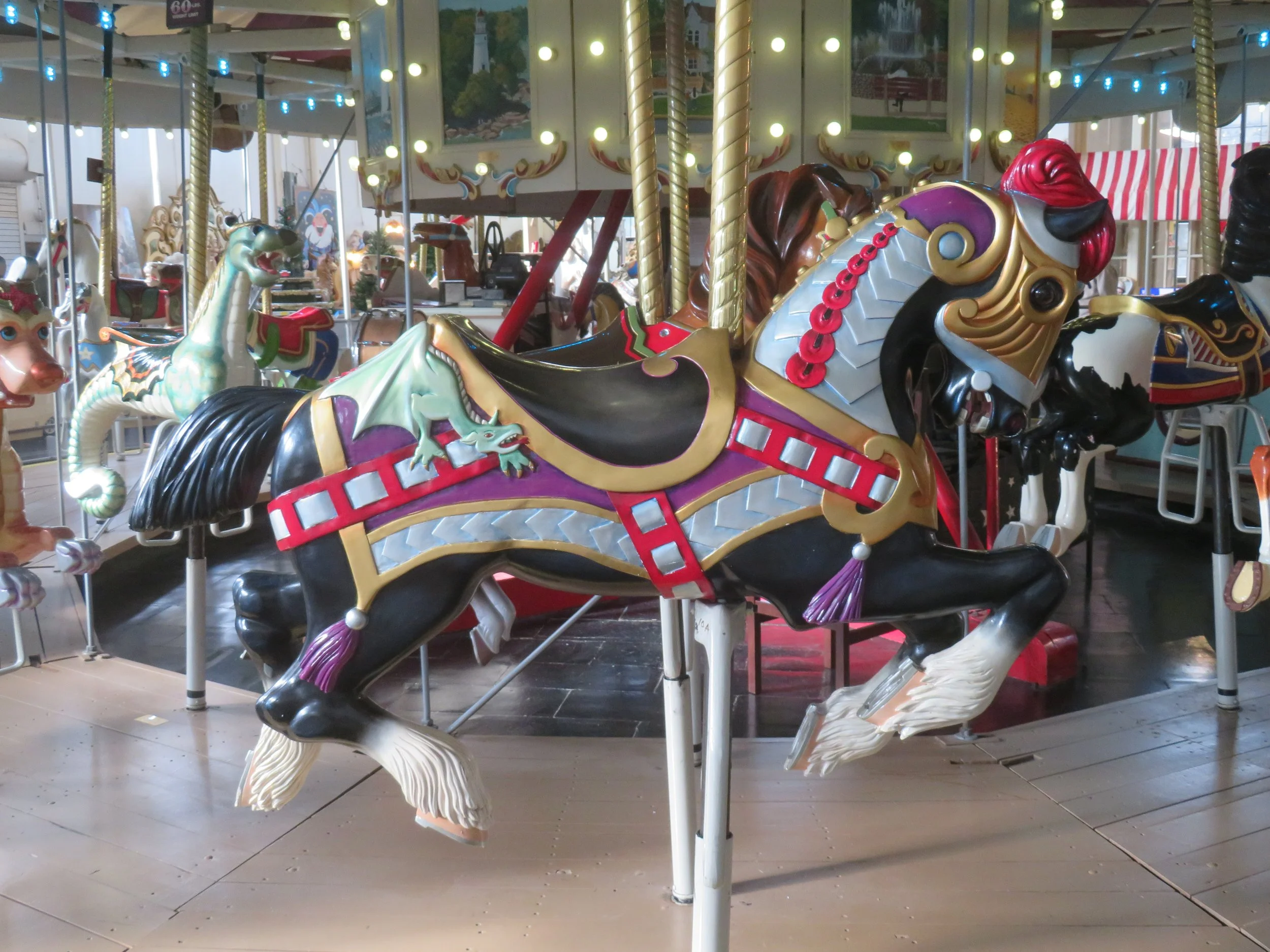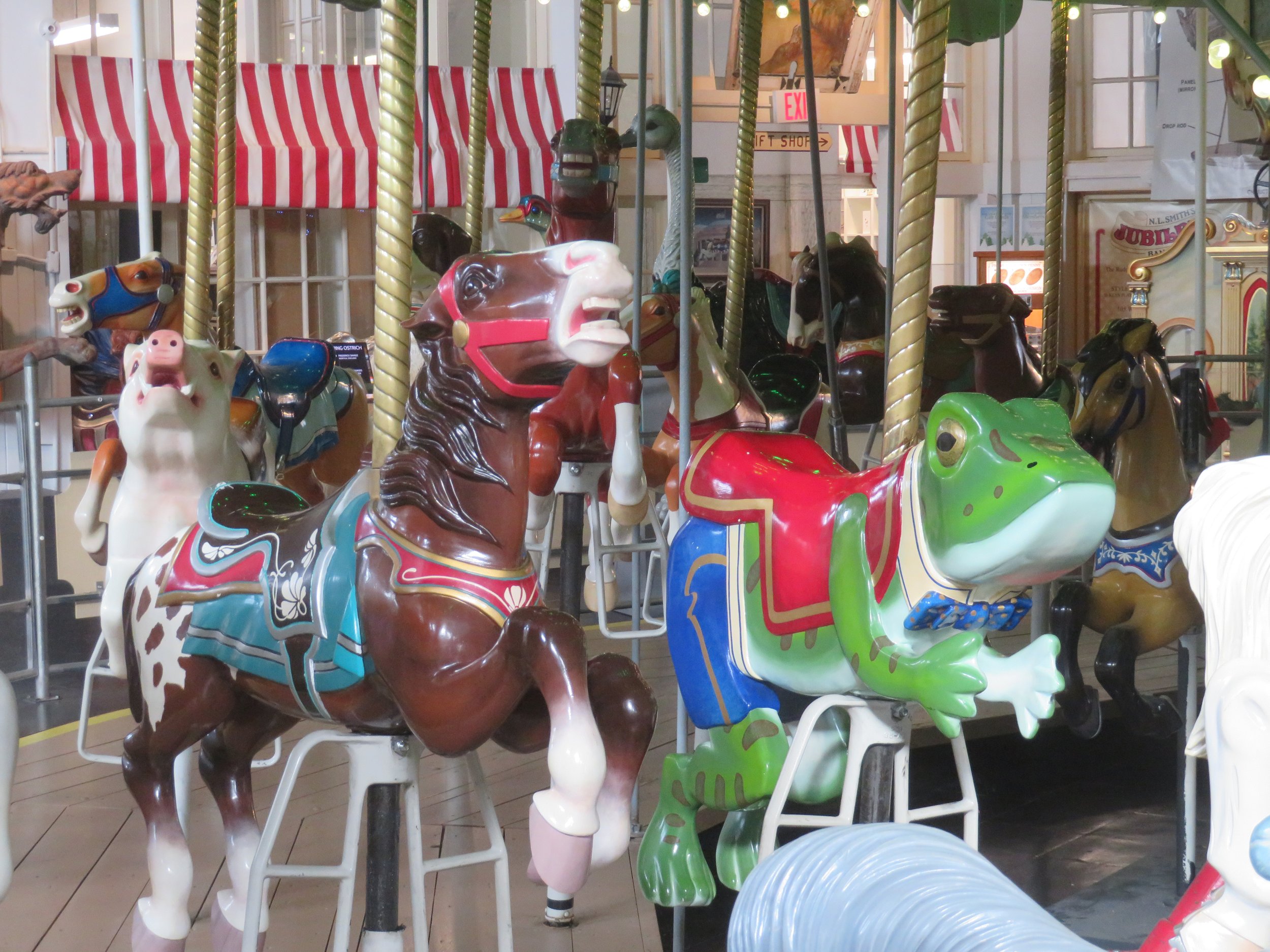 We took a ride on the carousel (included with our ticket price of $7/senior). The animals that move up and down are called jumpers or gallopers versus the stationery ones aka standers or prancers and the benches are called chariots. I rode a jumping ostrich. David stuck with a horse. We’ve got a lot to learn about carousels.