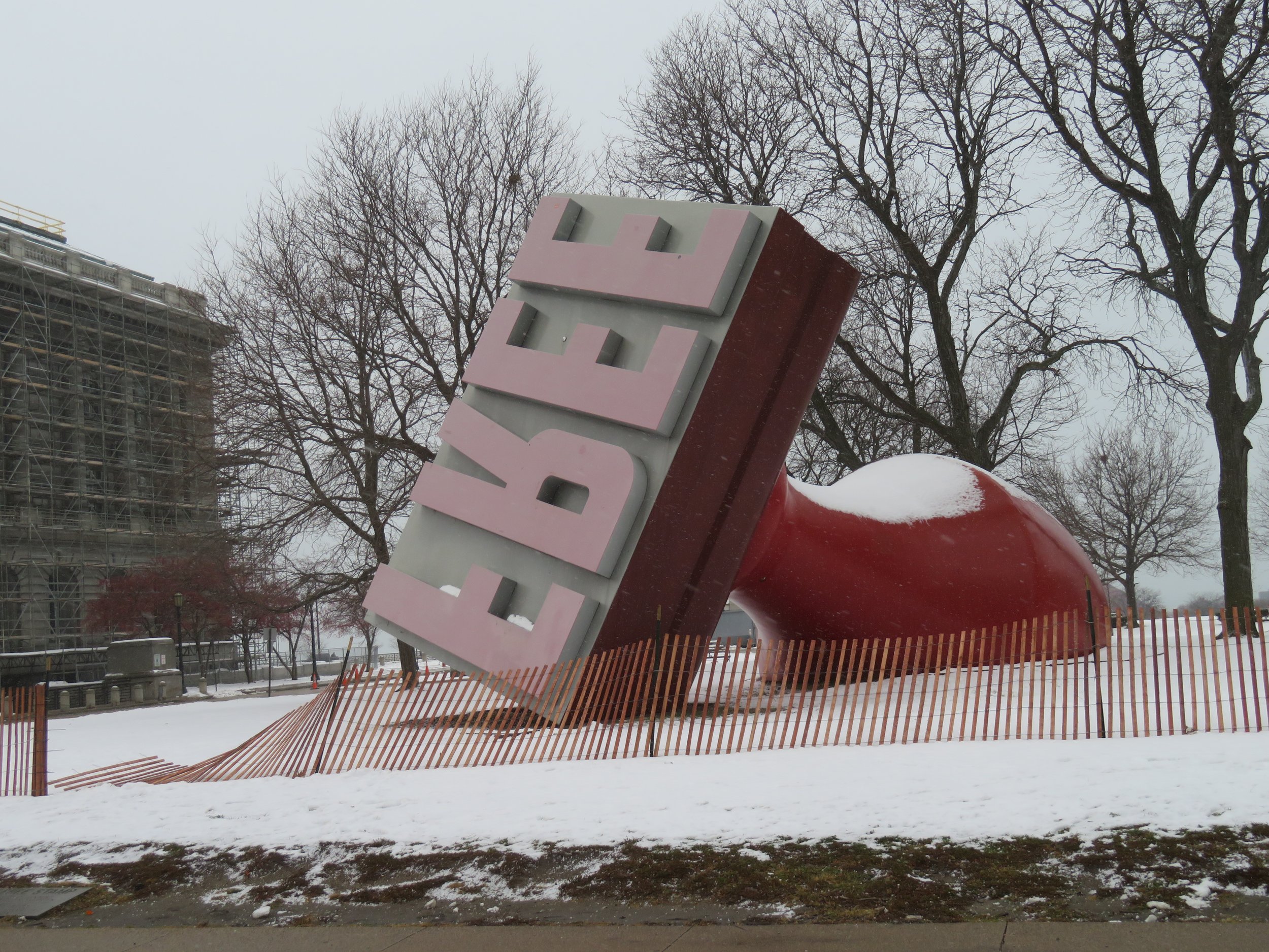 Created by Oldenburg and van Bruggen in1985 for Sohio (Amoco), there was some controversy over the word ‘FREE’ when BP purchased Sohio the following year. The creators assured the new owners that ‘free’ was in celebration of the emancipation proclamation and the end of the Civil War. BP felt differently and had the sculpture removed and ‘incarcerated’ in a warehouse for several years. Eventually, it was gifted to the city and is now displayed prominently in the park. Read more about the history here.