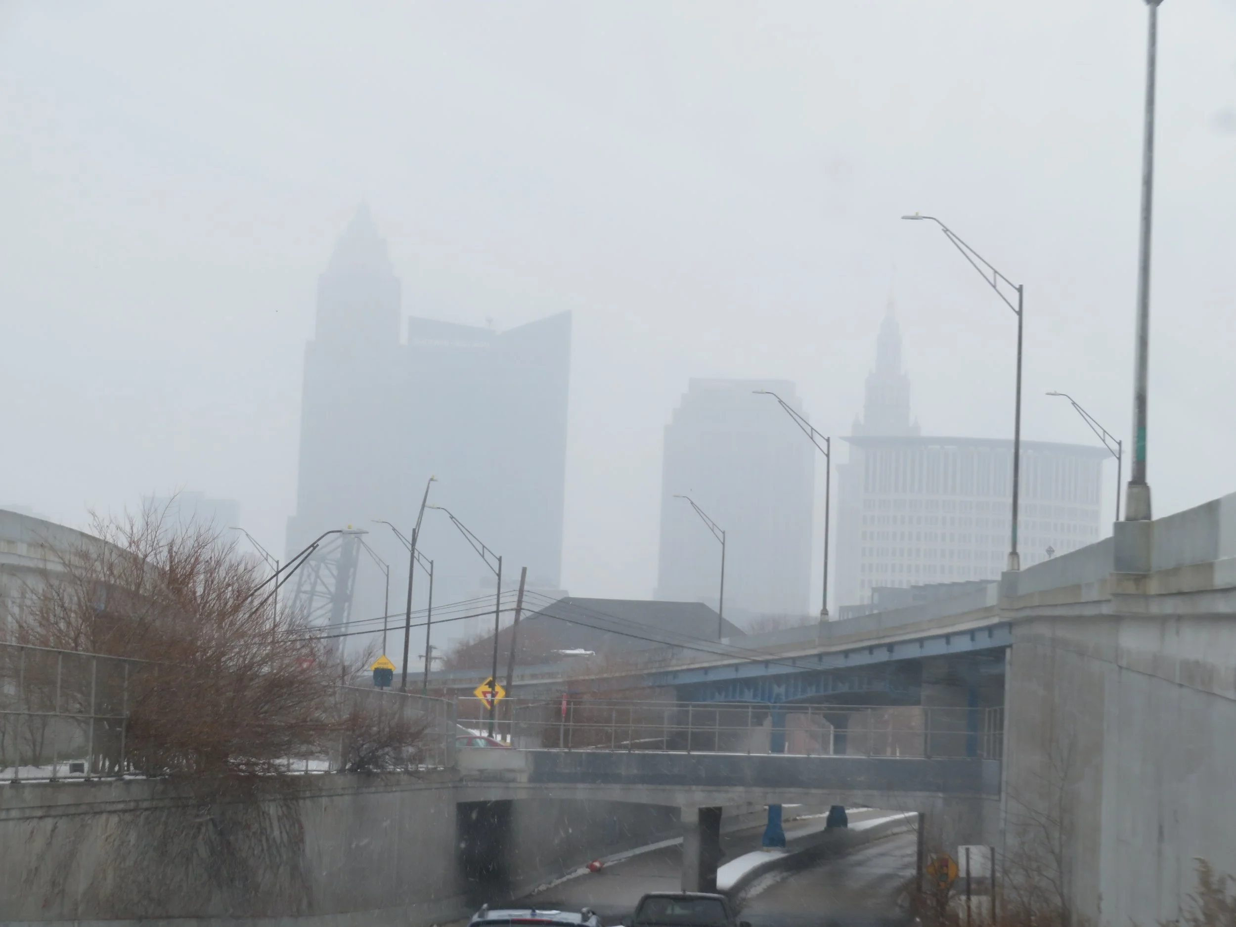 A cold and hazy Cleveland Skyline as we approach the city on US-6.