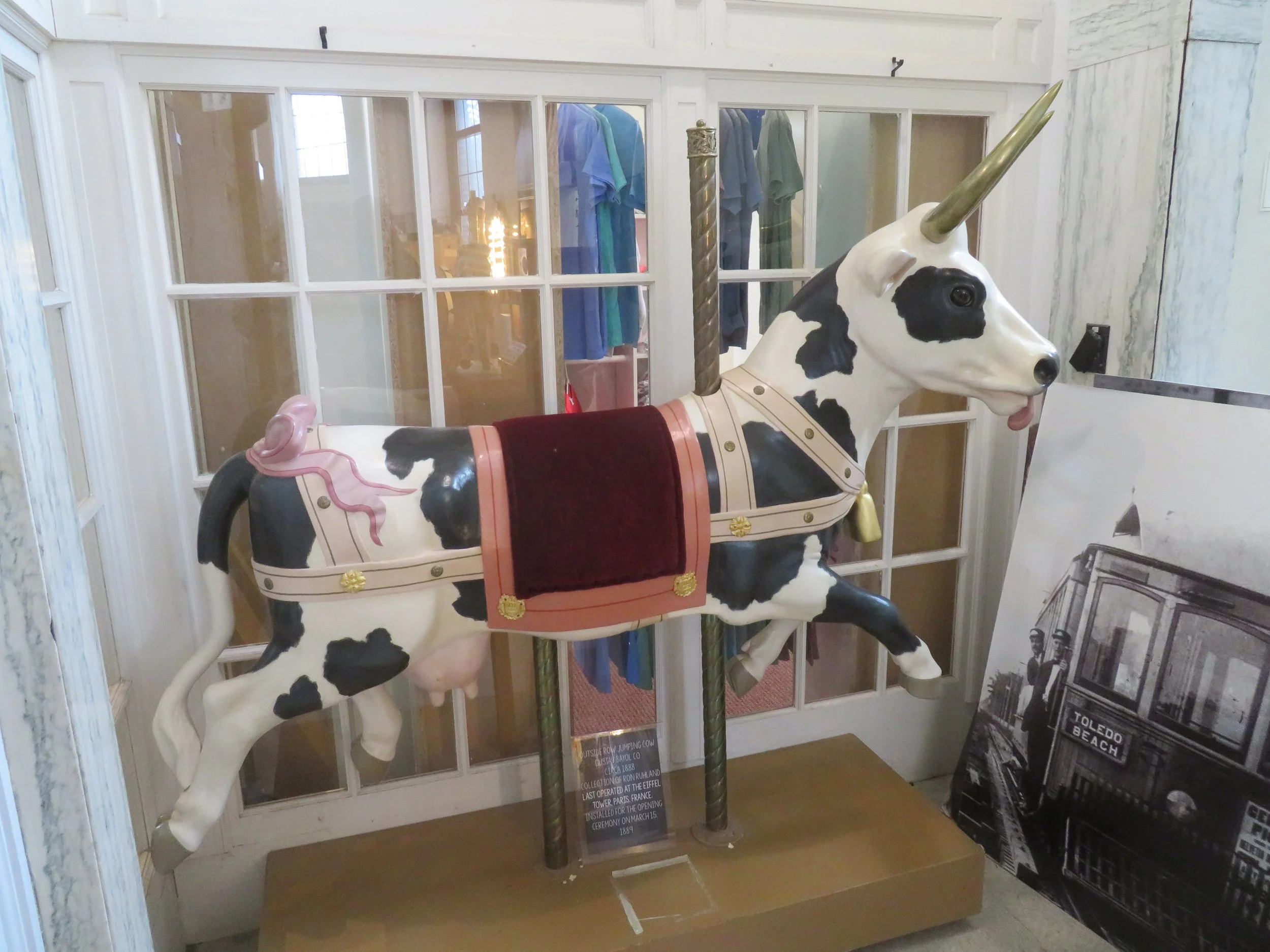 A notable carousel bovine was the Jumping Cow created c.1888 by Gustav Bayol Co. and installed for the opening ceremony of the Eiffel Tower in Paris on March 31, 1889.