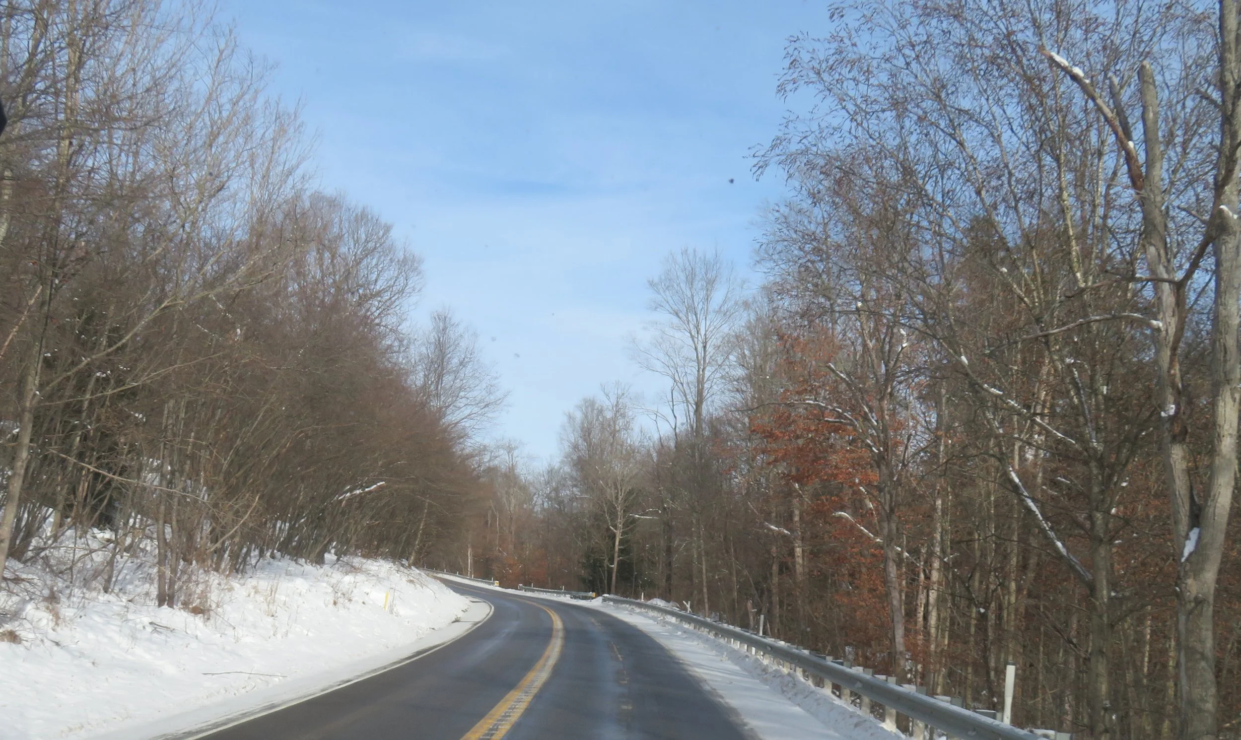 The roads were dry, but deceptively slick in tree-shaded areas. We passed through small towns with stately old houses separated from the next town by snow-covered fields. Smoke curled from farmhouse chimneys. The two-laned highway threaded its way through forested areas with snow laced trees.