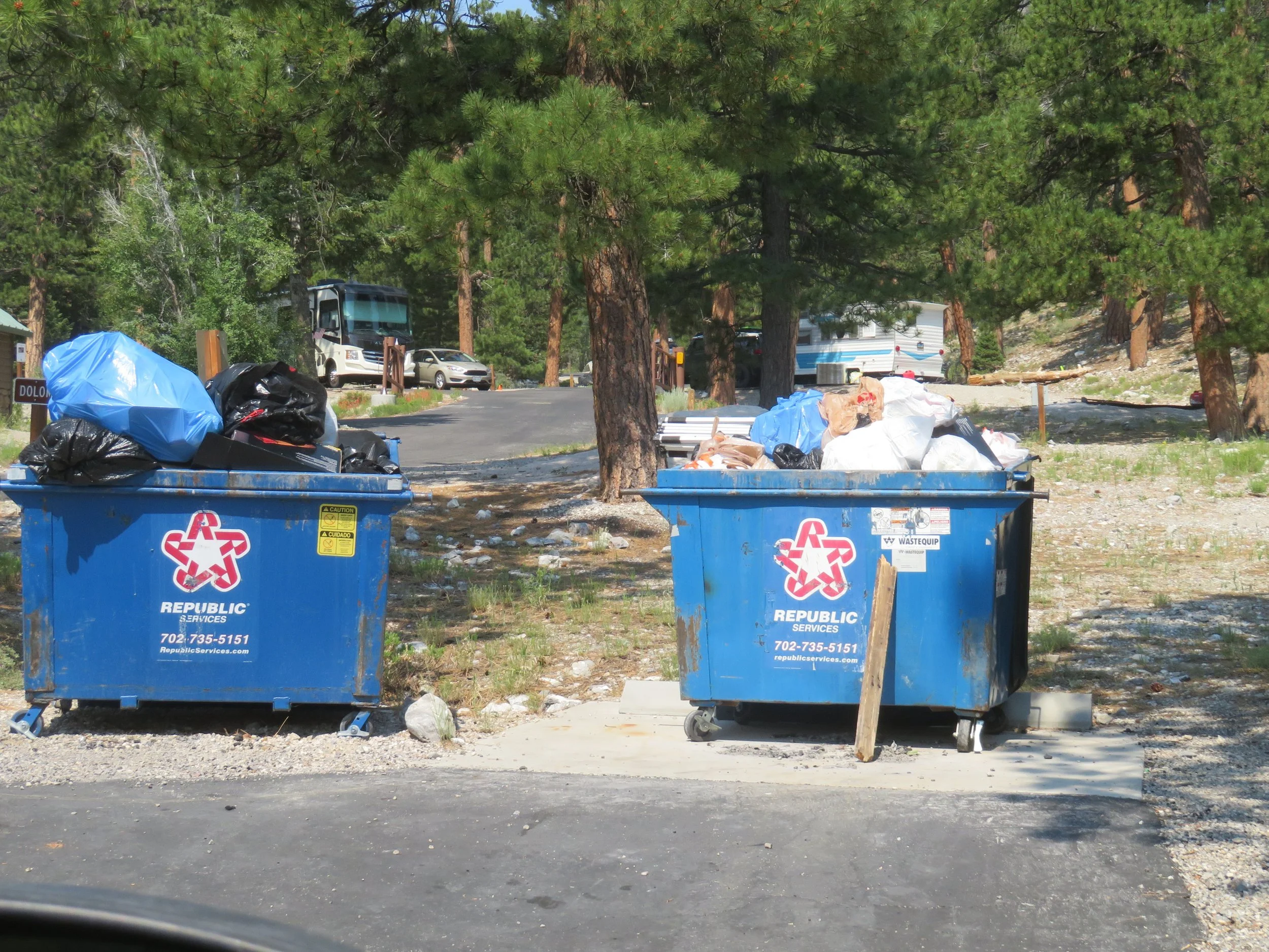 Another issue was the state of the trash bins… overloaded with trash tumbling out and definitely in need of an empty. The trash trucks came late the next day, not a moment too soon. We spent a few minutes picking up trash and refuse that had fallen out of the dumpster on its way to the truck. We’ve gotten used to carrying hand sanitizer with us for toilet visits and trash pick-up. There was no camp host in residence which might have accounted for the state of the campground. Still, with all my complaints, this is a lovely place to be, opposed to the sweltering heat in the Las Vegas Valley and staying inside with the A/C blasting.