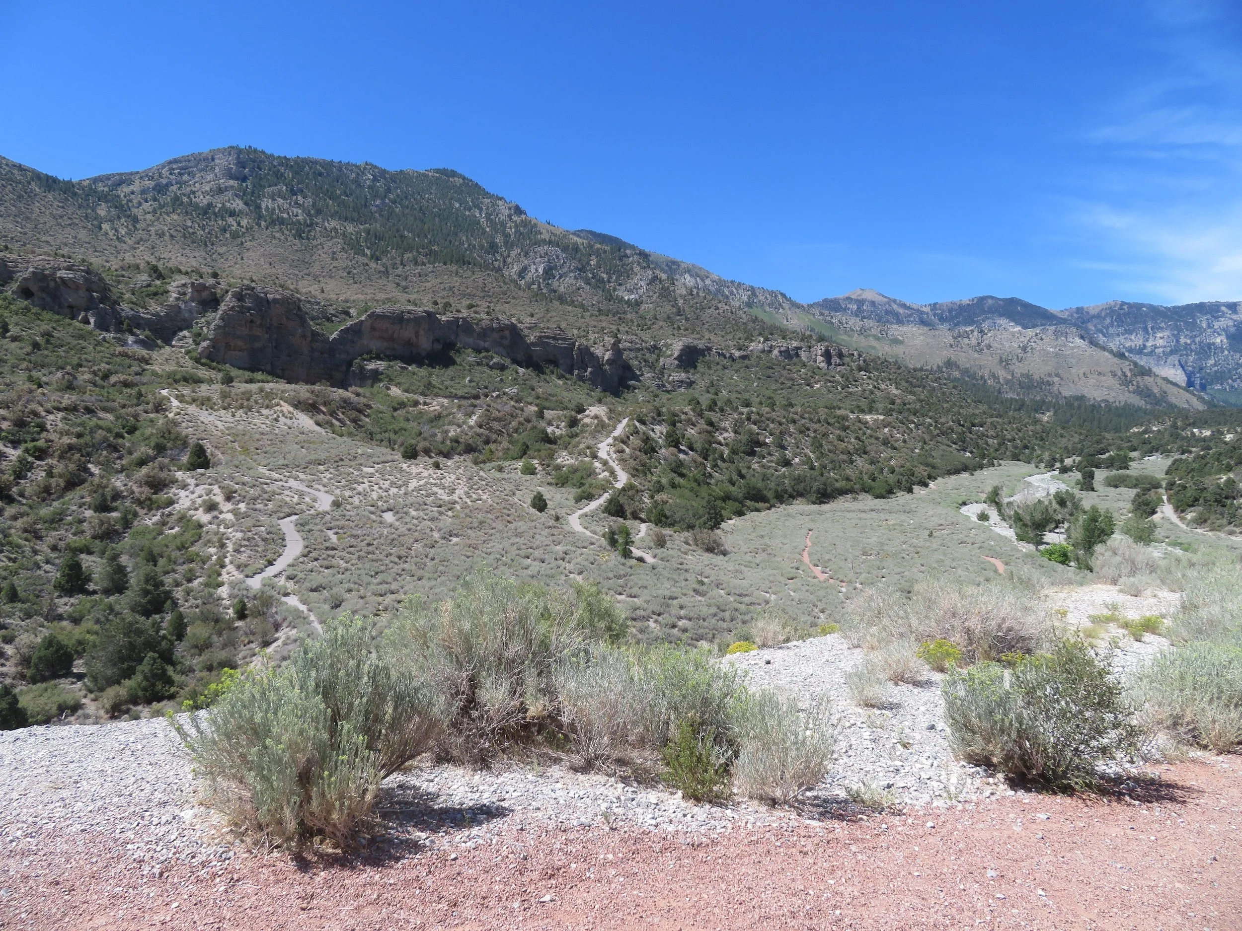 The Spring Mountains area is considered a ‘sky island’, a real geographical term (not just from the Legend of Zelda) describing “a mountain range that is separated from other mountain ranges by distance and by surrounding lowlands of a dramatically different environment.” In this case, the Spring Mountains rising up out of the Mojave Desert provide a cooler, high-altitude environment that supports several different plant biomes and several endemic species found nowhere else in the world.