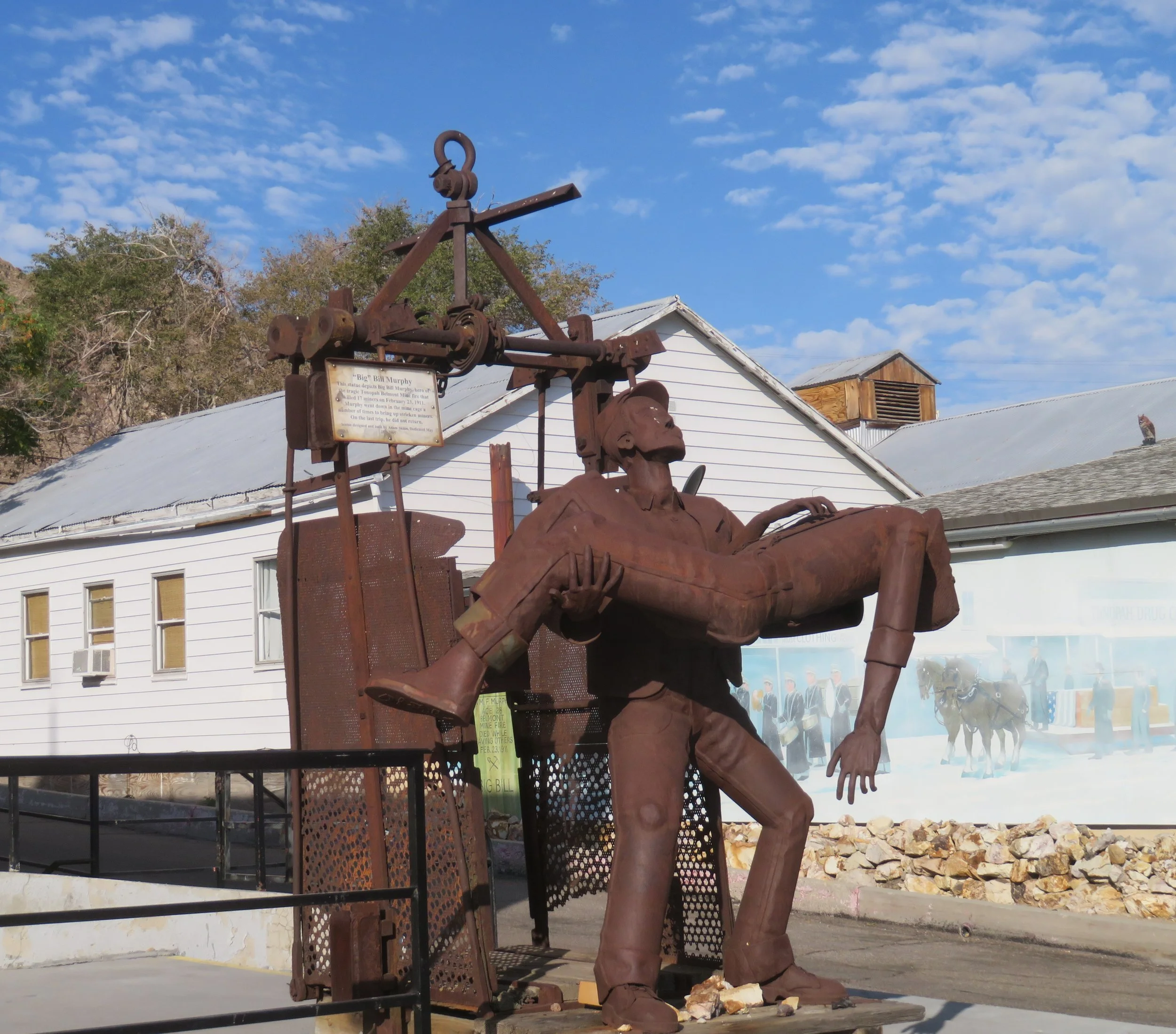 ‘Big Bill” Murphy is buried in this cemetery, and he’s a town hero. Back in 1911, the Tonopah Belmont mine fire killed 17 miners, including Big Bill, age 28, who repeatedly descended in the mine cage to rescue miners below. On his last trip down, he didn’t make it back up. The town honors him with a statue and a mural.
