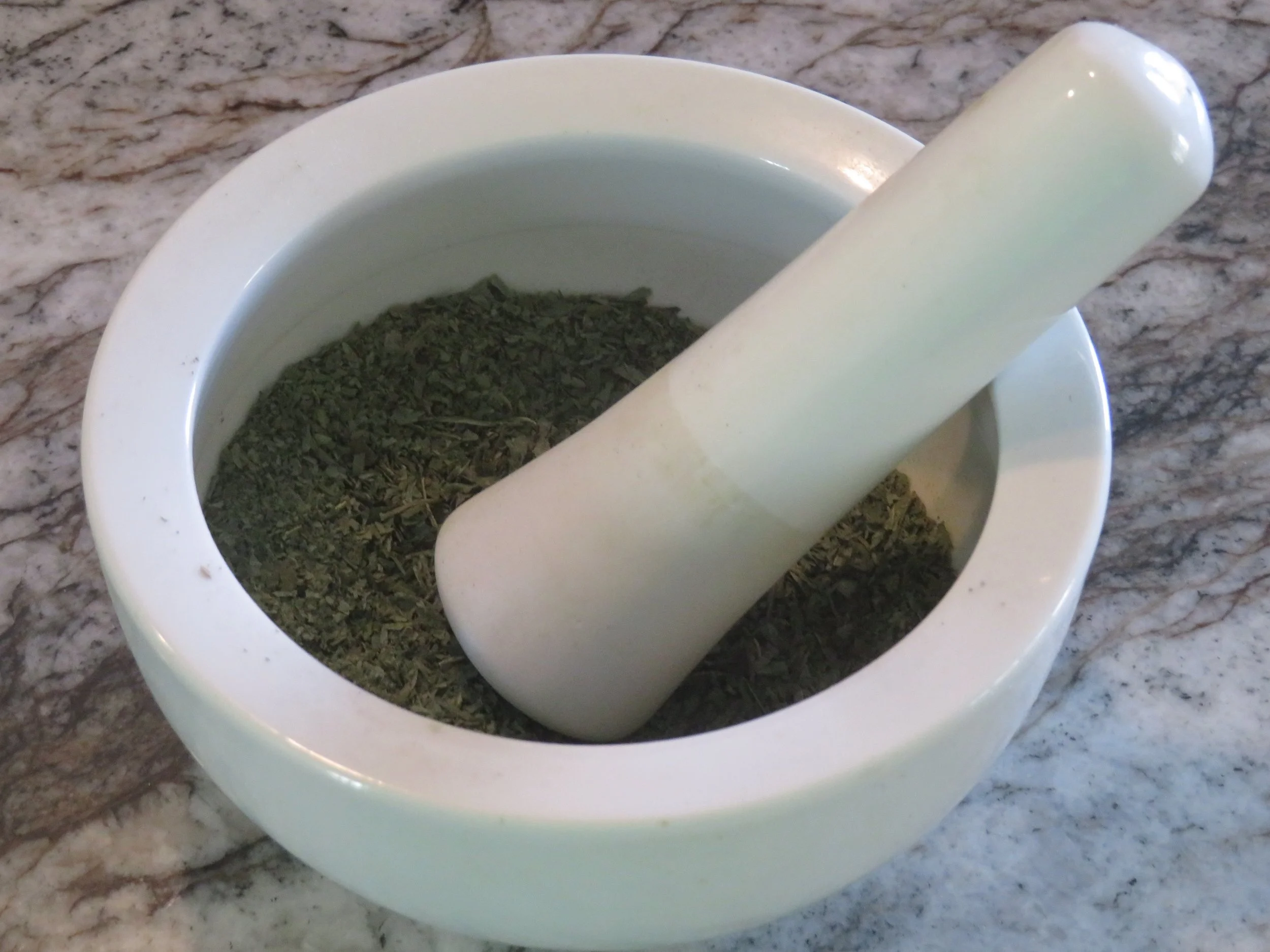 I decided I’d dry it for future use when this basil has produced its last fragrant leaf. I cut several stems, tied them together with a string, and hung them in our hot, dry garage. They were bone dry in just a few days thanks to Nevada’s 4-8% usual humidity. I carefully separated stem from leaf and set about crushing and pulverizing them using a mortar and pestle. I purchased a couple of glass spice-size jars from Hobby Lobby for the finished product. After much picking, drying, crushing, and pulverizing, I found it takes a hell of a lot of basil leaves to fill a little spice jar and an inordinate amount of time. And just how much dried basil am I going to use? Other options? I searched the Internet to find more.