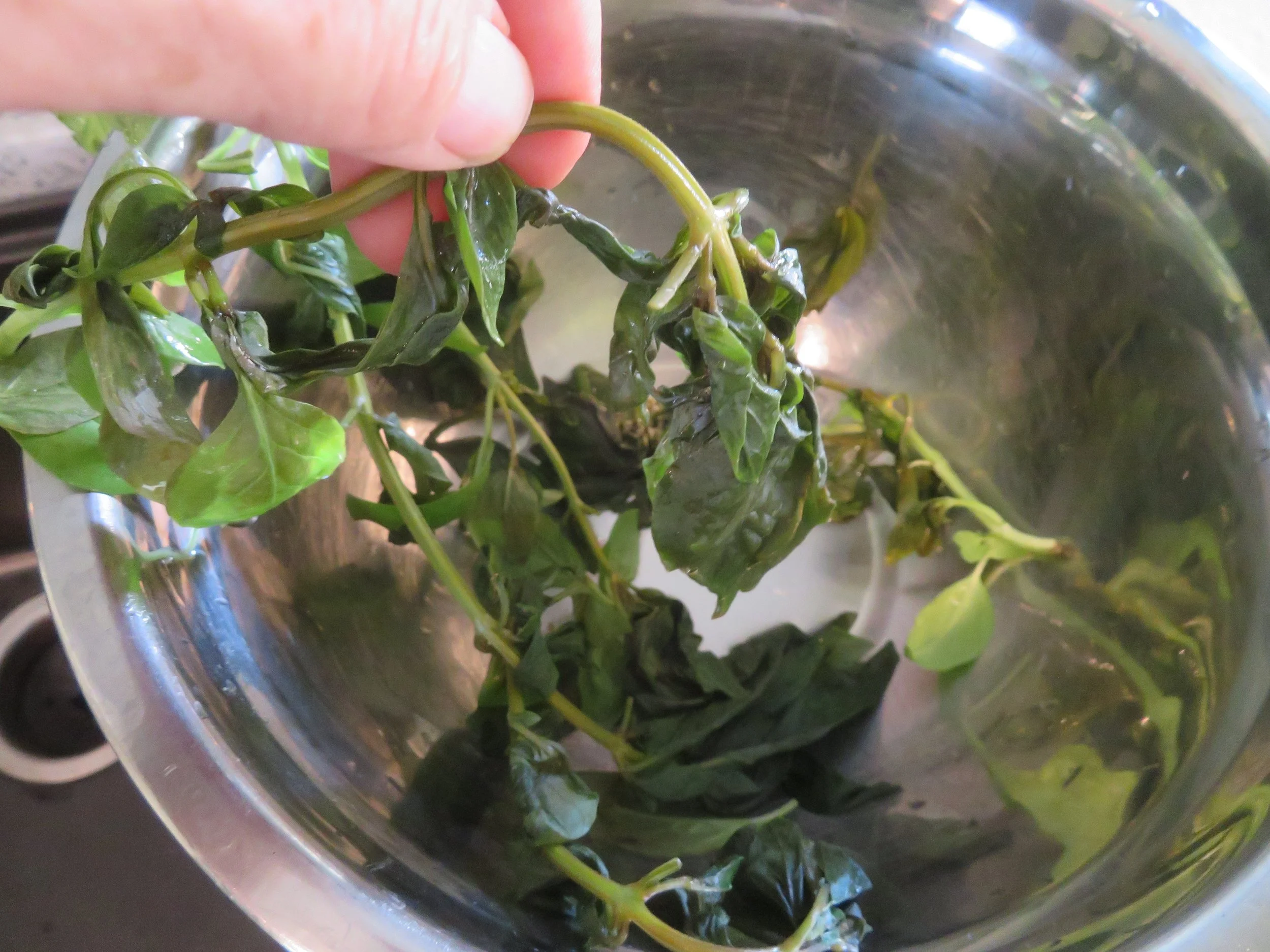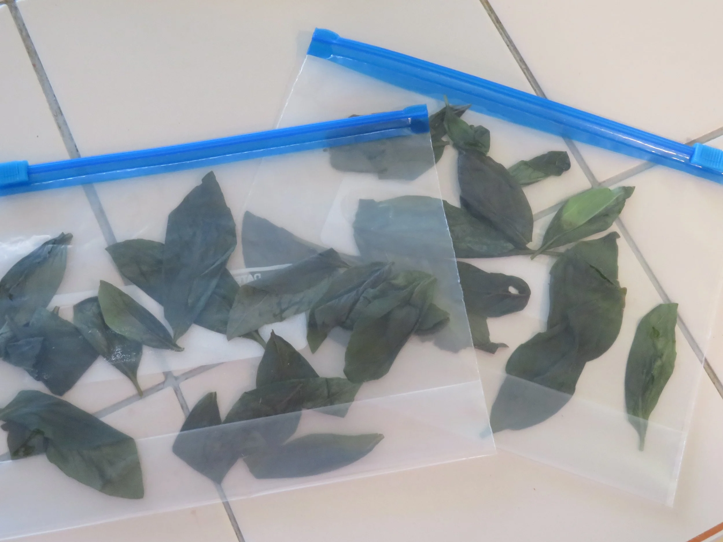 Gardenary suggested blanching and freezing the leaves. It sounded easy, but it was a longer process than I thought it would be. After boiling a pot of water and dipping the stems in it to wilt the leaves, I dipped them in ice water to stop the cooking process. That was easy enough. It was removing the individual wilted leaves from the stems, placing them carefully on a paper towel, and blotting them dry that took the time. The wilted leaves were a bit flimsy… wilted and folded over on themselves. So laying them out flat, blotting them dry, and then trying to get them into a freezer bag without ‘bunching’ them was a bit time-consuming, but I got it done.