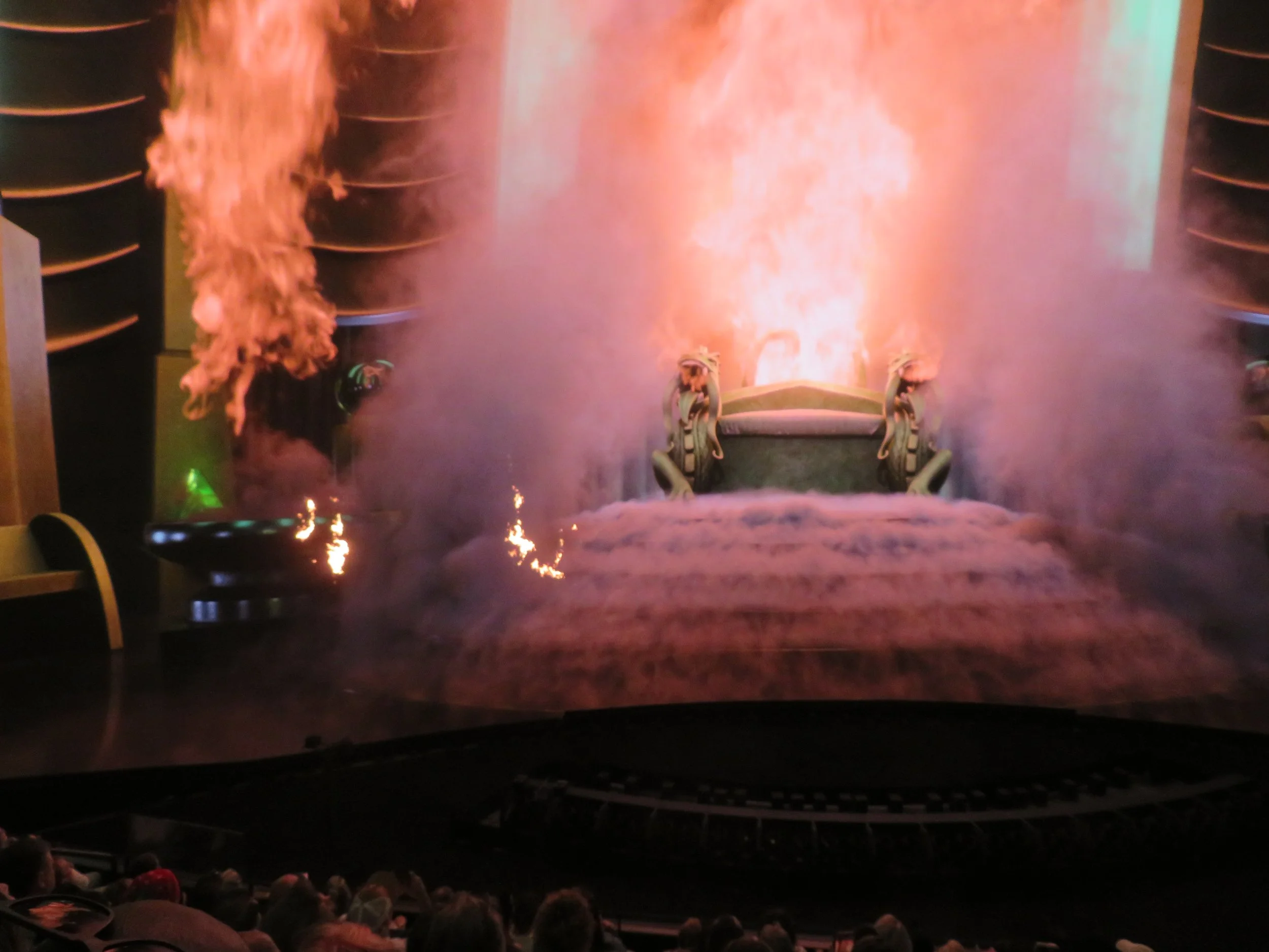 Fog and fire provided special effects. The wizard was definitely formidable on the huge screen as smoke and huge flames shot up on the screen, and real smoke and flames shot up in front of the screen.