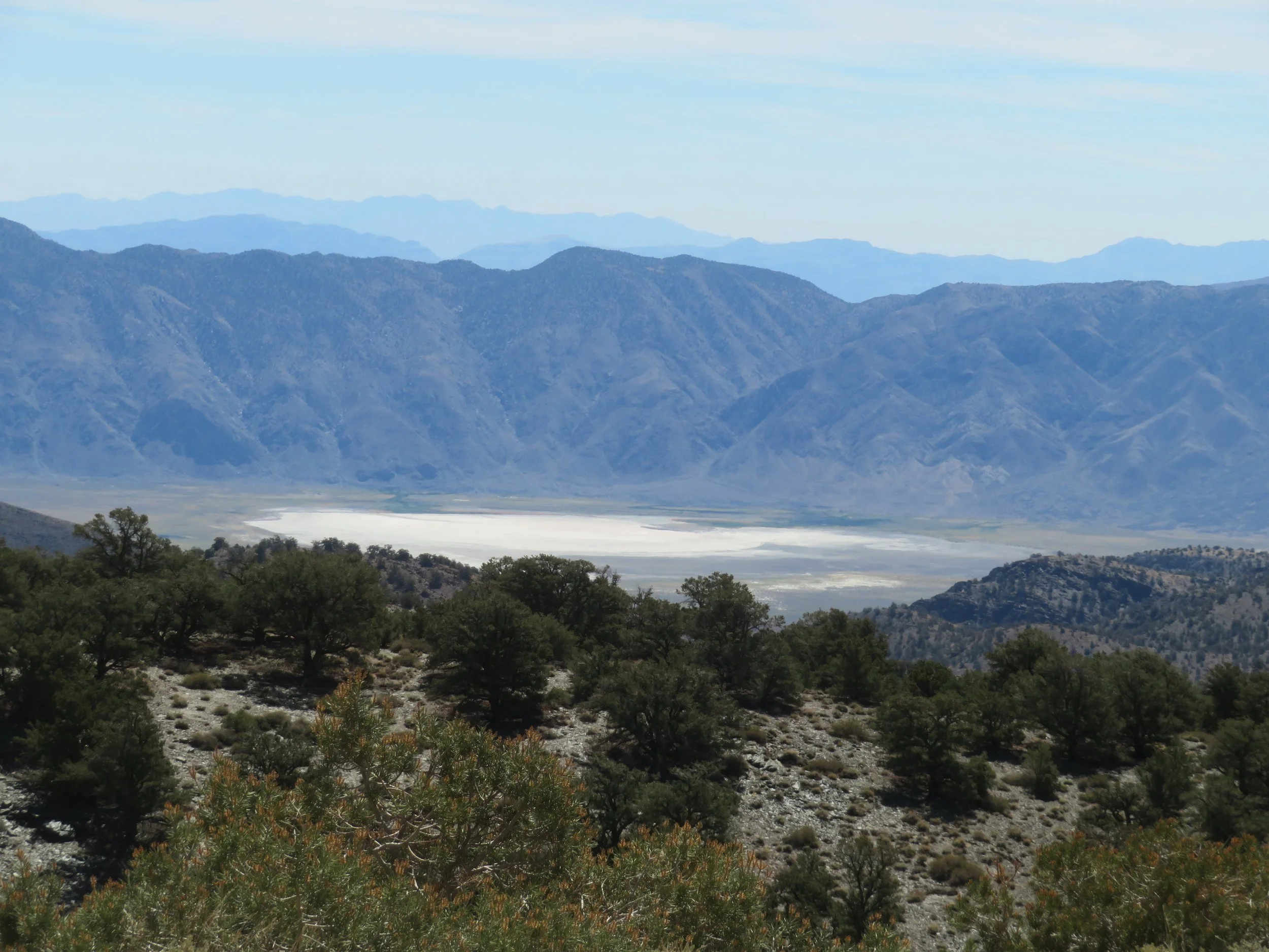 We stopped at the Grandview Campground (altitude 8600’/2621m) en route to check it out. From a vantage point at the campground, we were able to see Deep Spring Lake in the distance. According to an info sign at the vista, Deep Springs Lake is a playa, i.e., a seasonal salt lake that generally dries in the summer to produce a salt pan, with surface water replenished in late spring with flows from nearby springs and snowmelt.