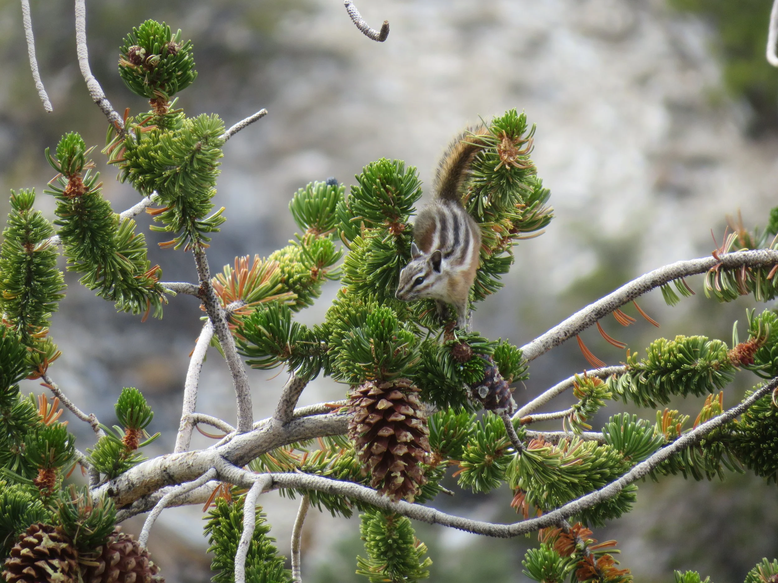 A fellow hiker we met on the trail pointed out the female bristlecones (larger and purplish in color ) from the male ones (small and reddish/orange), which was interesting. The male cones produce pollen, which is dispersed in the wind. The female cones produce ovules that develop into winged seeds once fertilized. The female cones also have the bristles on their cone scales for which the tree was named. “Sap on female bristlecone pine cones is a natural, protective resin secreted by the tree to heal wounds, which are often caused by insects feeding on the developing cones. This glistening, sticky substance is part of the cone's protective mechanism, although it can also signal insect damage.”