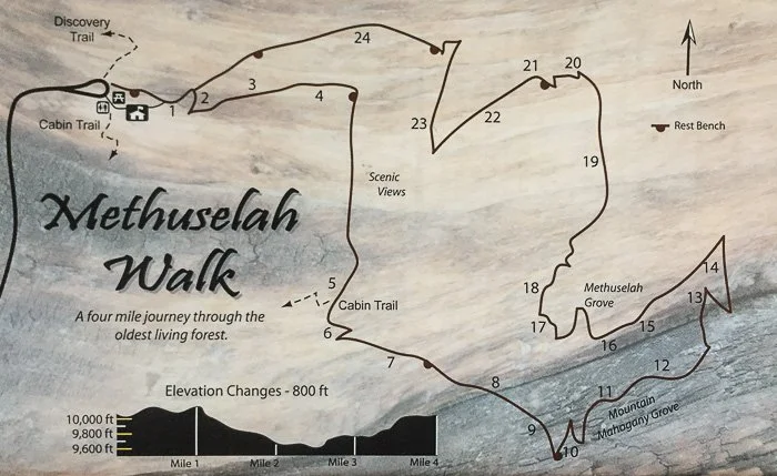 With a copy of the trail map in hand as well as an AllTrails map loaded on our phone, we headed out to the Methusaleh Trail, a 4.5 mile loop which would take us to the general vicinity of the gnarly old guy’s neighborhood. The forest service has not specifically pointed out Methusaleh’s exact location for fear that vandals will opt to chop him down or take a chunk of him home for a souvenir. Sad commentary, but true.
