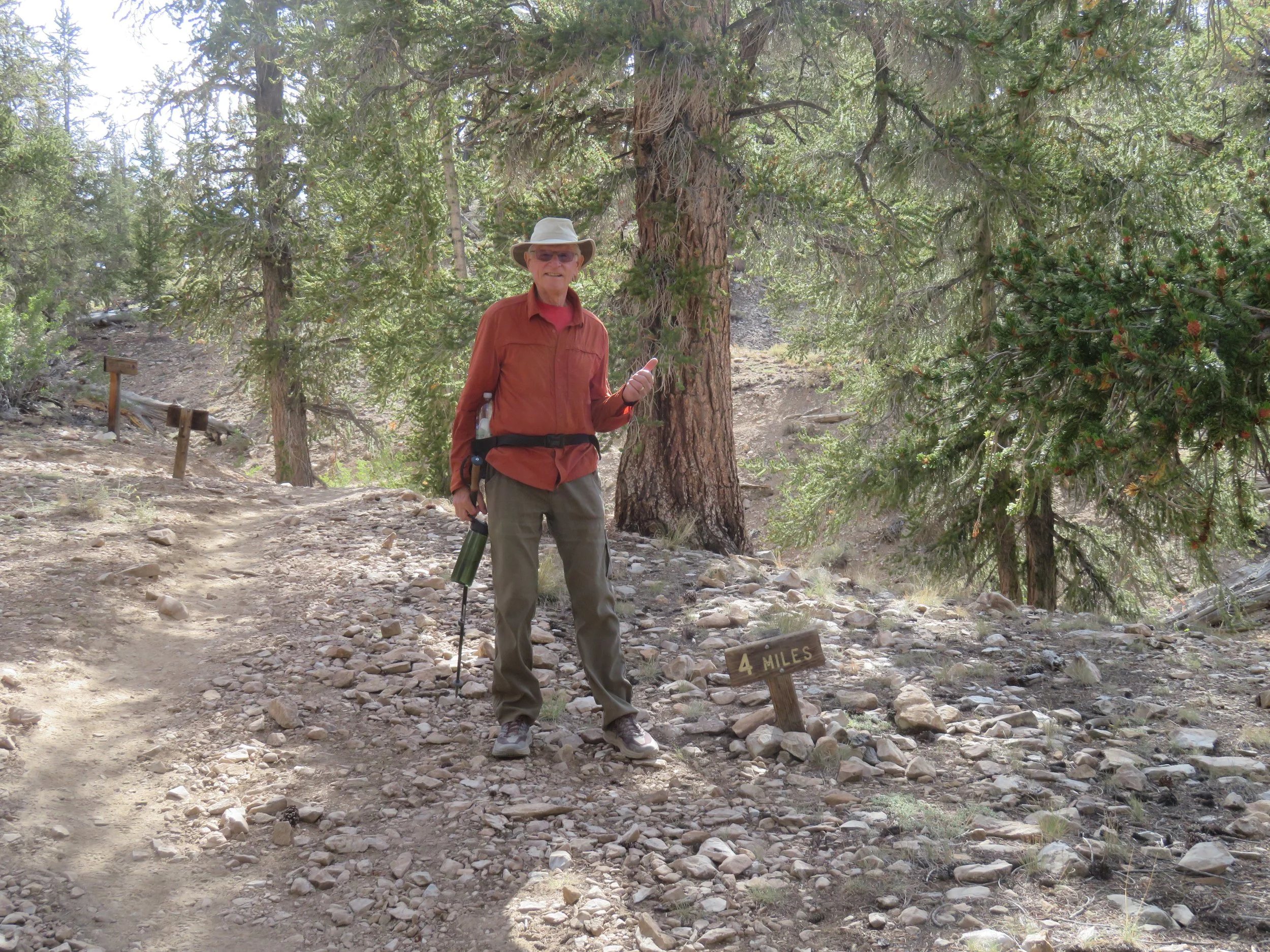 When we left Bishop, the temperature was near 100F/37.7C. Here at the trailhead at 10,453’/3186m, the temp was a pleasant 78F/25.5C, although the altitude did have us breathing a bit harder than usual. The trail is considered moderate with an elevation gain of ~900’/274m. With all the ups and downs following the terrain, however, we gained and lost that elevation several times on the trail.