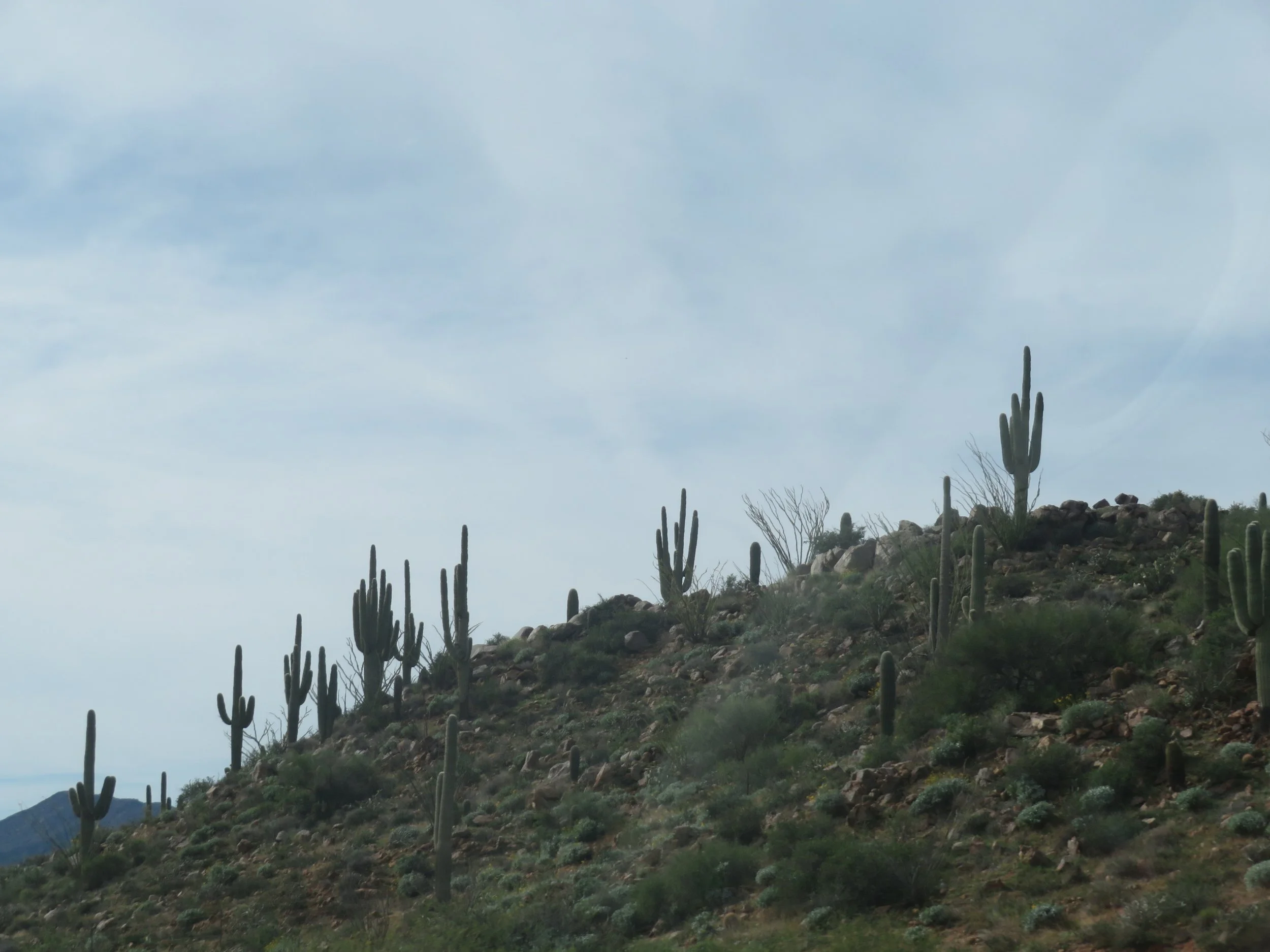 We caught up with Brennan briefly in the morning as he headed to work, and we headed out for the final leg of our trip. It was gray, cloudy, in the mid-50s, and sprinkling rain when we left Mesa. By the time we joined up with US-93 (a blue highway, by the way), it alternated between sprinkles and rain showers. The saguaro cacti dotting the hillsides must have enjoyed the drink.