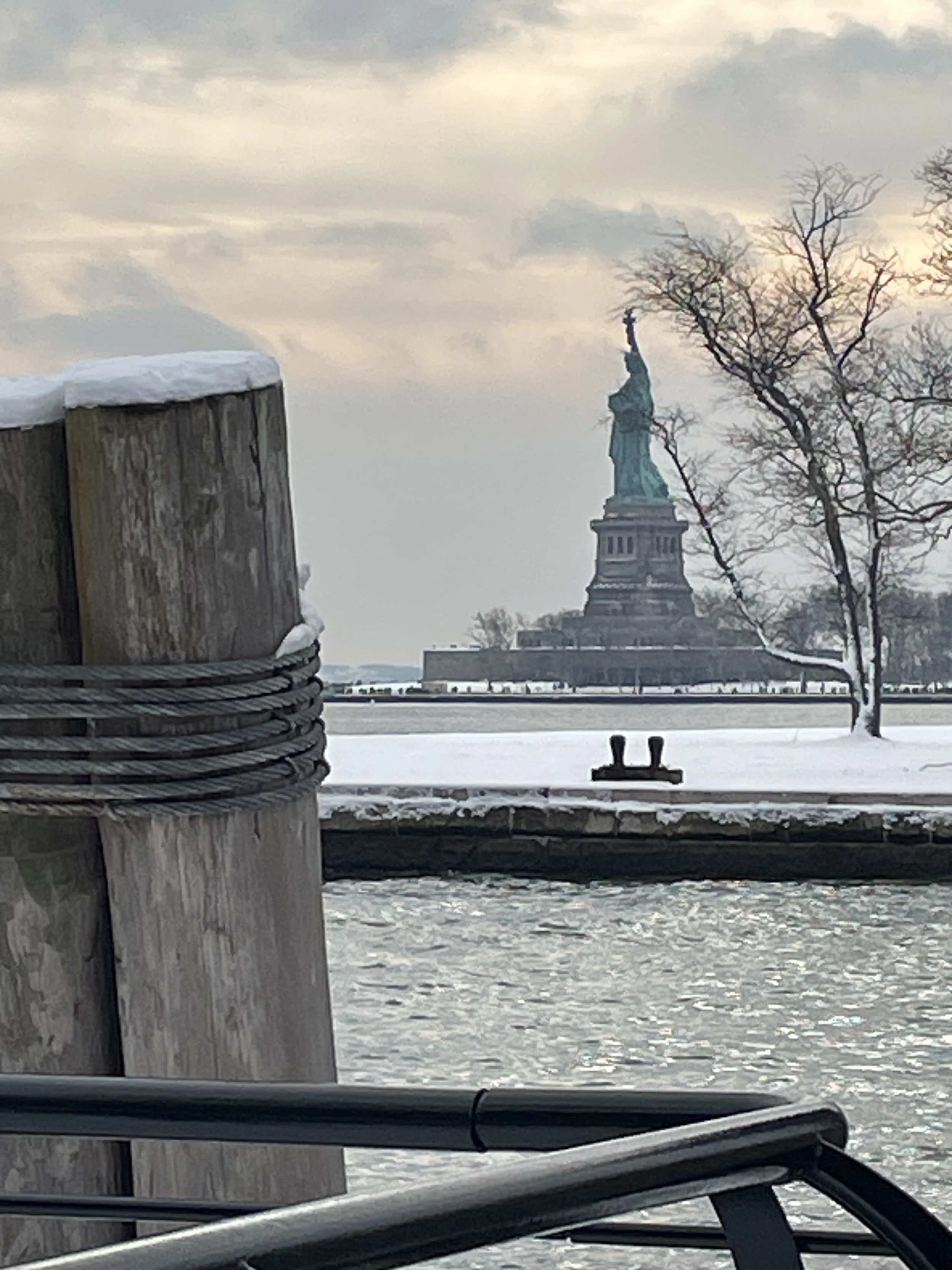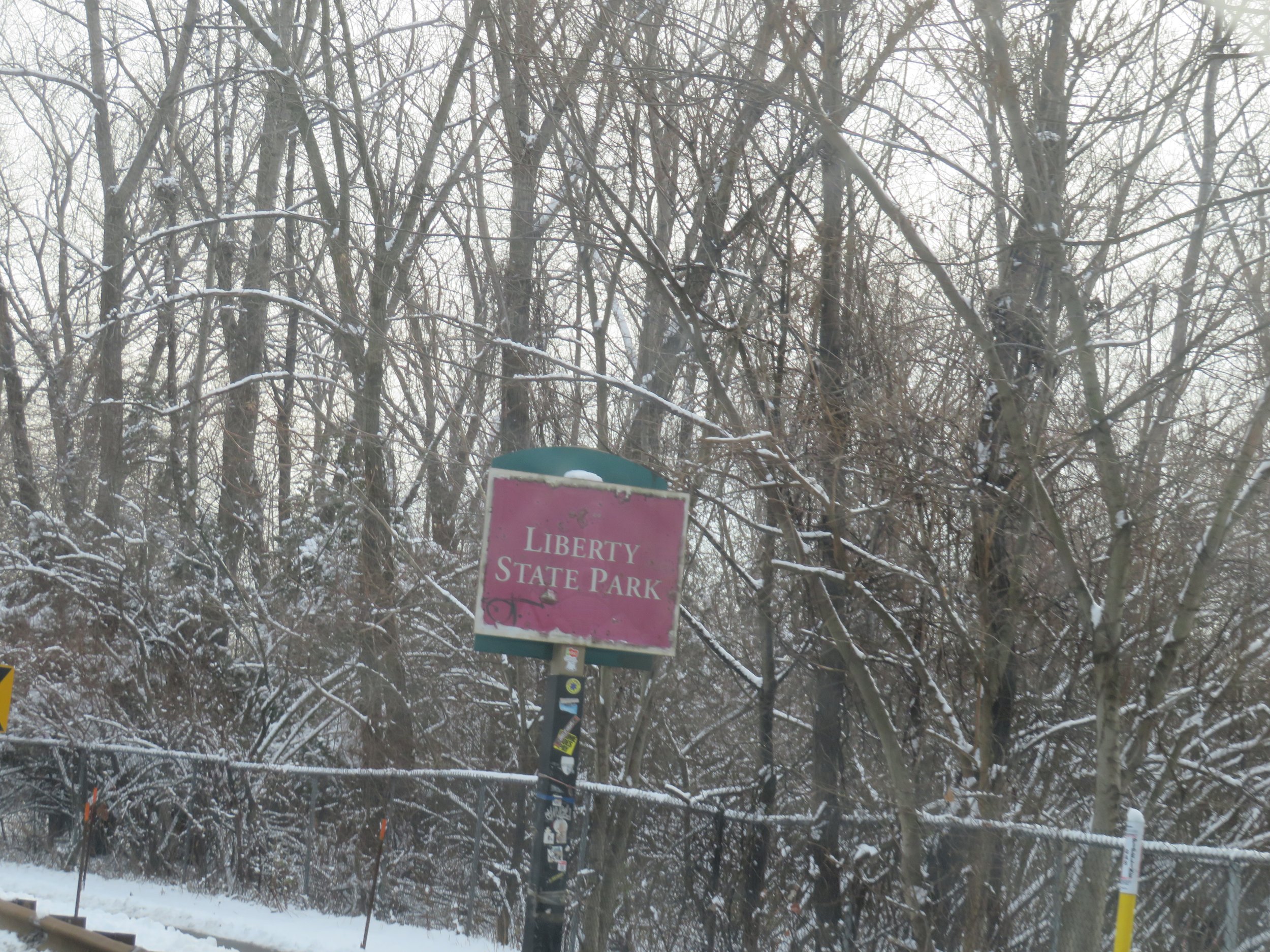 We stayed in a nearby hotel and wended our way via a circuitous route through Jersey City to Liberty State Park. The entrance drive to the park, Freedom Way, is cobblestone and lined with trees. With its newly acquired blanket of snow, it was a lovely wrapping for my gift.