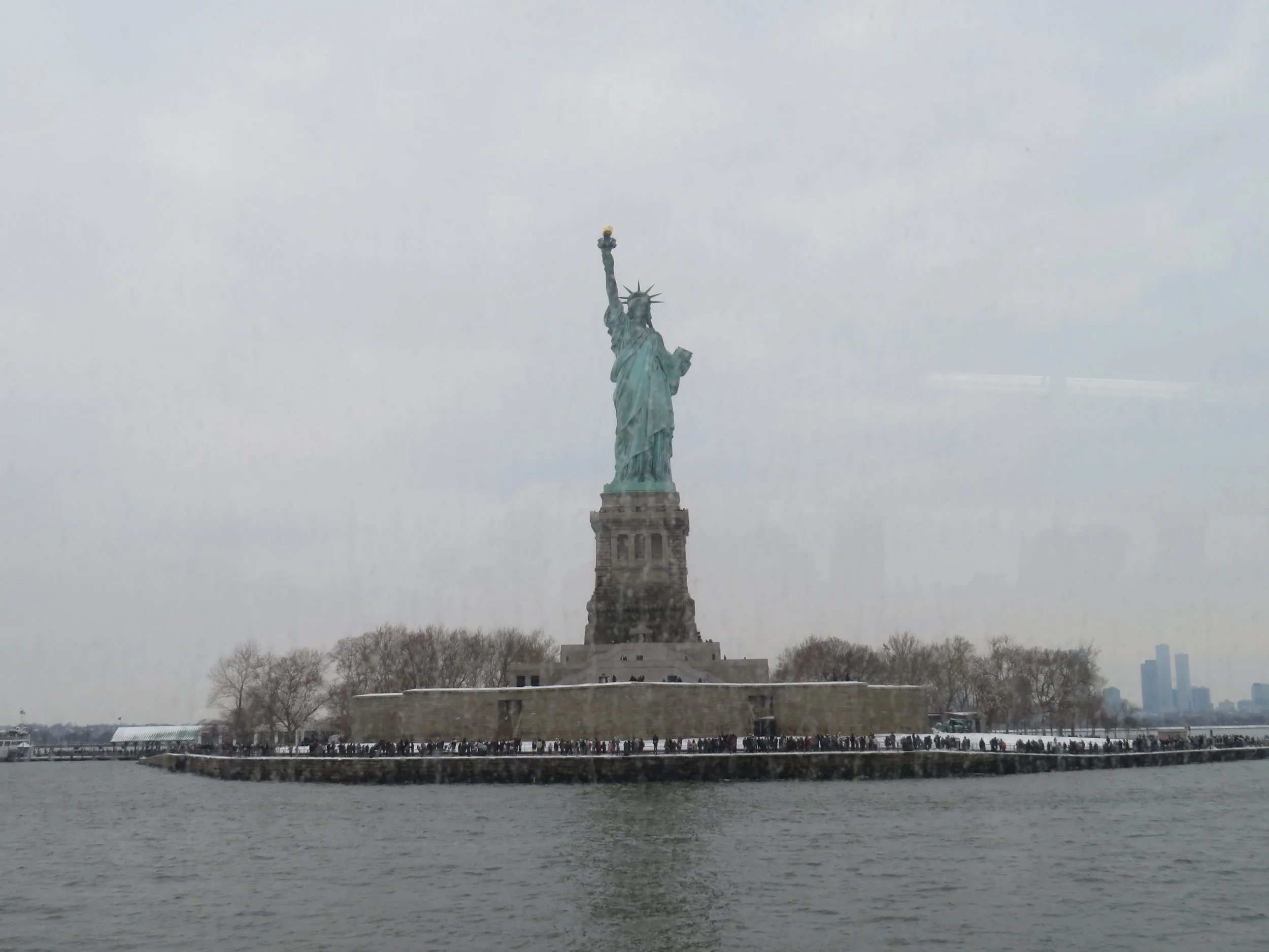 The small area atop the steps was very crowded and Rangers herded the lot of us to the outside observation deck which was also extremely crowded. Though cold and windy, the views made up for any discomfort… the Manhattan skyline, Ellis Island and New York Harbor lay before us.