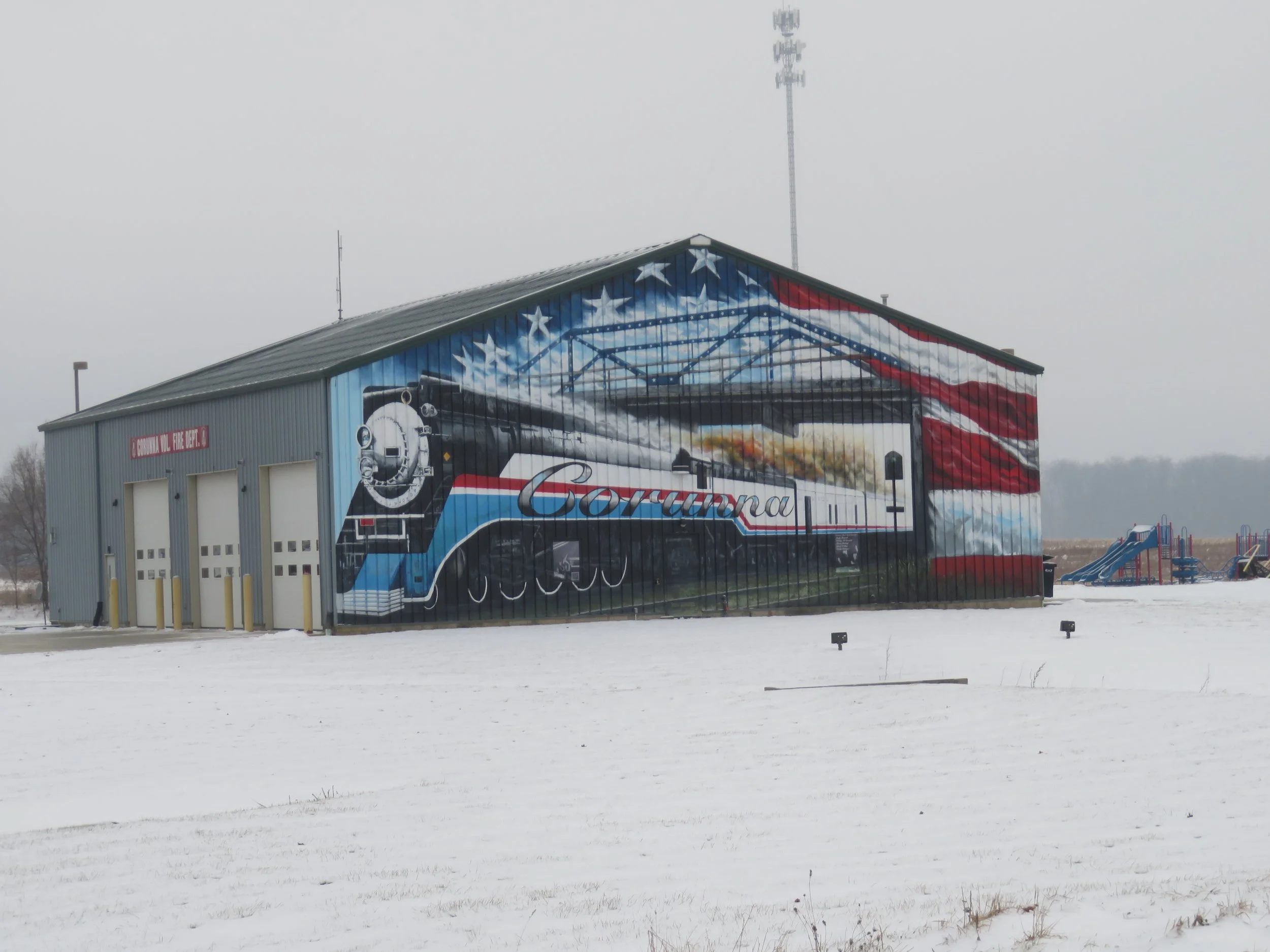 We woke to a very cold, 19ºF/-7ºC (feels like -1ºF/-18ºC), gray, snowy morning. We cleared several inches of white powder from Blanche then trudged out our luggage, packed up and headed out. I’d seen an entry in Atlas Obscura for the ‘Center of the World’. It was only a couple miles away in Leavittsburg on OH-5 East, just before the junction of OH-82.