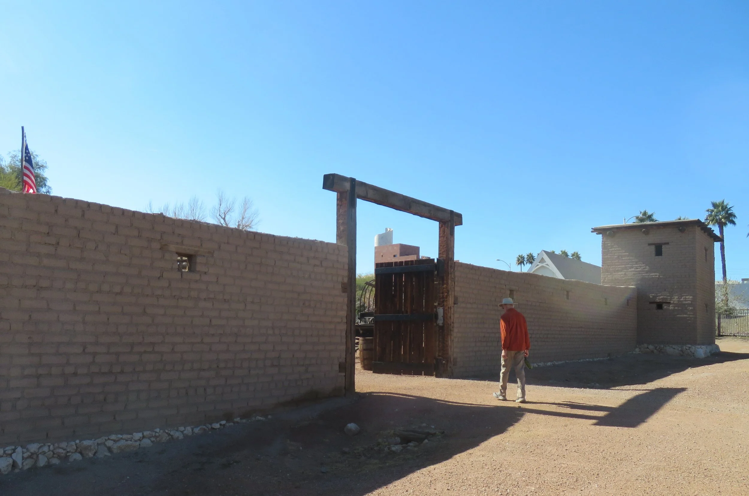 The original adobe brick fort walls have long ago eroded, but have been re-created by the historic park.