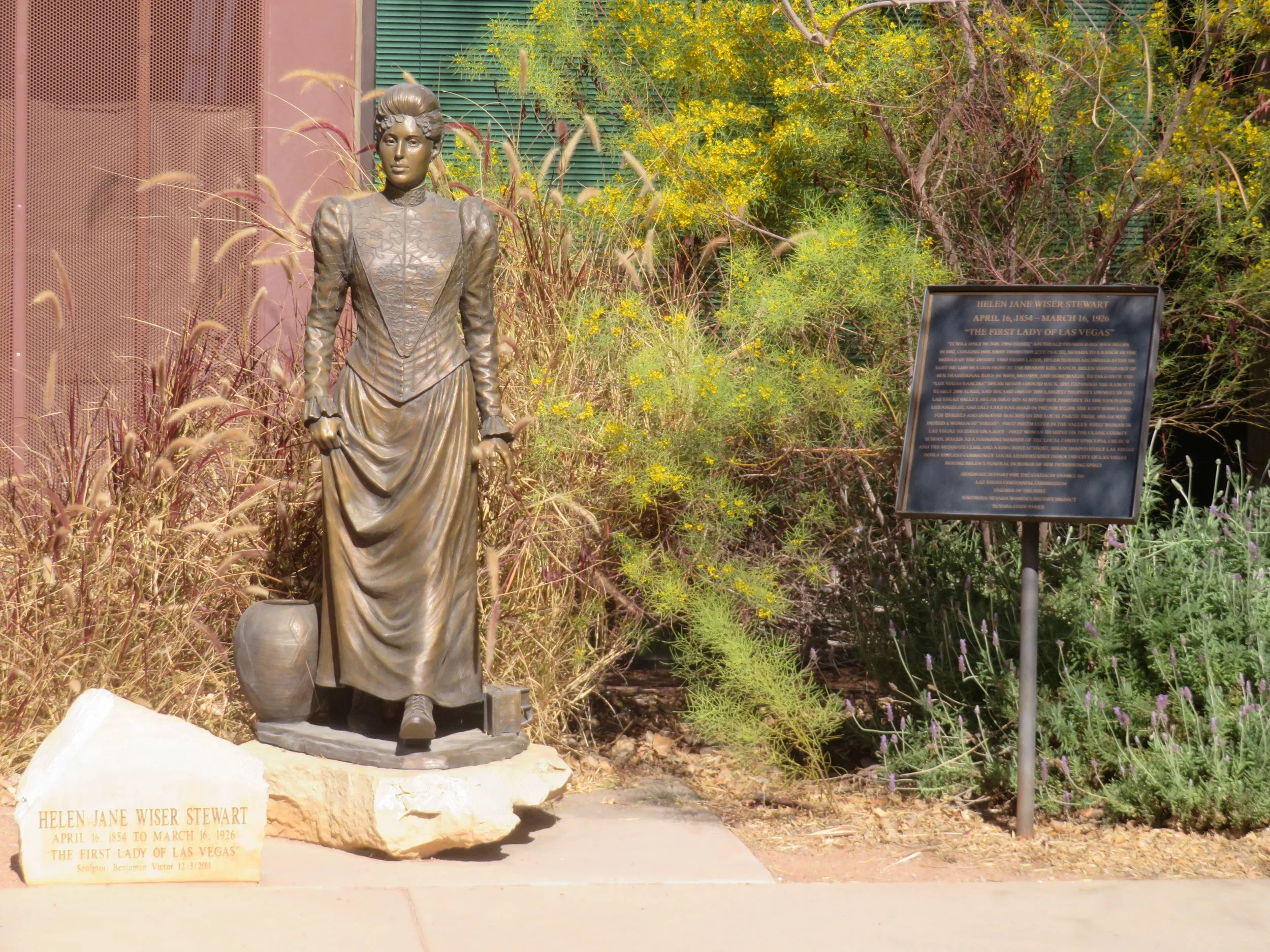 A statue of Helen Jane Wiser Stewart stands proudly in the courtyard outside the fort's entrance. Considered the ‘First Lady of Las Vegas’, Stewart was a southern Nevada pioneer woman, the first postmaster of Las Vegas, and the first woman elected to the Clark County School District’s Board of Trustees. It was Stewart who donated land for the Las Vegas Grammar School, which was the first public school attended by Native American students.