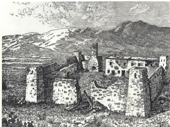 Line drawing of the Old Fort by Thaddeus Kinderdine, 1858