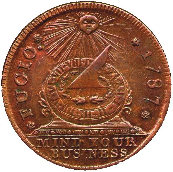 The U.S. Mint produced the first copper penny, known as the Fugio cent or the Franklin cent (it was purportedly designed by Ben Franklin), back in 1787. On the coin were the mottos “Fugio” (I flee) and “Mind Your Business”. Franklin was encouraging his countrymen in America to work hard and not waste time. You know… ‘Take care of the pennies, and the pounds take care of themselves.’