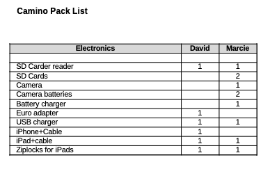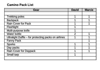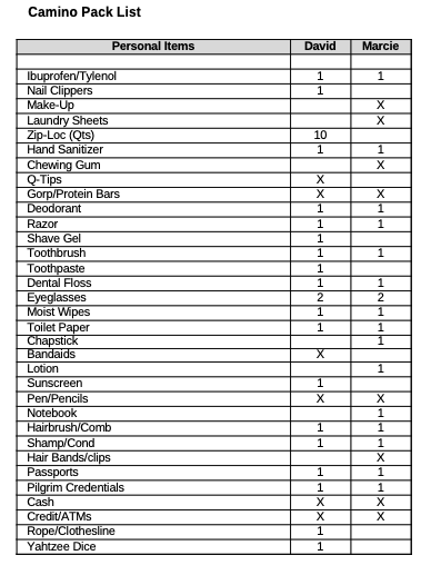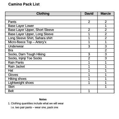 This time, as we pack for our trek on the Camino Portuguese, we'll try once again to keep our packs under 20 pounds. It should be easy enough - as long as we keep repeating the mantra "Just the essentials". Here's our list: