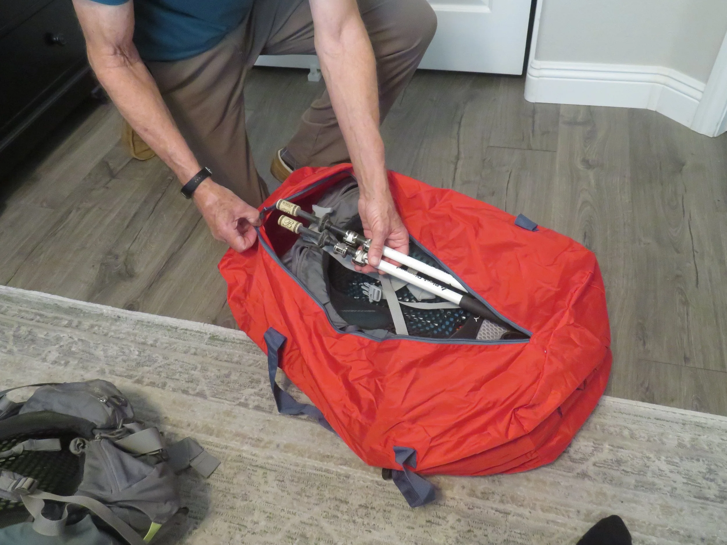 Note the corks on the ends of the trekking sticks to prevent them from poking holes in the duffle.